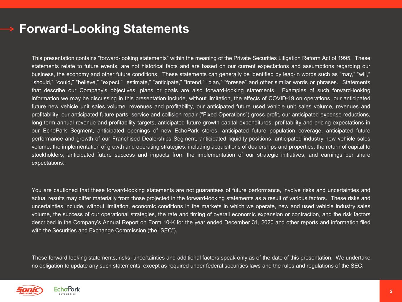 2 Forward-Looking Statements This presentation contains “forward-looking statements” within the meaning of the Private Securities Litigation Reform Act of 1995. These statements relate to future events, are not historical facts and are based on our current expectations and assumptions regarding our business, the economy and other future conditions. These statements can generally be identified by lead-in words such as “may,” “will,” “should,” “could,” “believe,” “expect,” “estimate,” “anticipate,” “intend,” “plan,” “foresee” and other similar words or phrases. Statements that describe our Company’s objectives, plans or goals are also forward-looking statements. Examples of such forward-looking information we may be discussing in this presentation include, without limitation, the effects of COVID-19 on operations, our anticipated future new vehicle unit sales volume, revenues and profitability, our anticipated future used vehicle unit sales volume, revenues and profitability, our anticipated future parts, service and collision repair (“Fixed Operations”) gross profit, our anticipated expense reductions, long-term annual revenue and profitability targets, anticipated future growth capital expenditures, profitability and pricing expectations in our EchoPark Segment, anticipated openings of new EchoPark stores, anticipated future population coverage, anticipated future performance and growth of our Franchised Dealerships Segment, anticipated liquidity positions, anticipated industry new vehicle sales volume, the implementation of growth and operating strategies, including acquisitions of dealerships and properties, the return of capital to stockholders, anticipated future success and impacts from the implementation of our strategic initiatives, and earnings per share expectations. You are cautioned that these forward-looking statements are not guarantees of future performance, involve risks and uncertainties and actual results may differ materially from those projected in the forward-looking statements as a result of various factors. These risks and uncertainties include, without limitation, economic conditions in the markets in which we operate, new and used vehicle industry sales volume, the success of our operational strategies, the rate and timing of overall economic expansion or contraction, and the risk factors described in the Company’s Annual Report on Form 10-K for the year ended December 31, 2020 and other reports and information filed with the Securities and Exchange Commission (the “SEC”). These forward-looking statements, risks, uncertainties and additional factors speak only as of the date of this presentation. We undertake no obligation to update any such statements, except as required under federal securities laws and the rules and regulations of the SEC.
