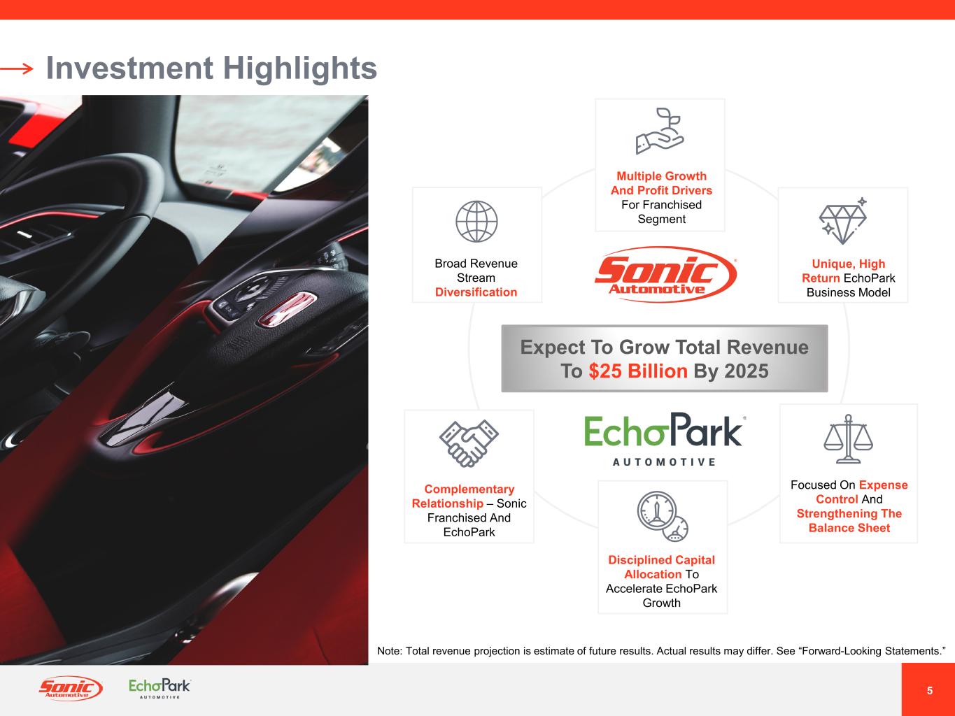 4 ® Sonic Automotive: Who We Are QUICK FACTS (NYSE: SAH) a Fortune 500 Company and One of the Nation’s Largest Automotive Retailers 116 20+ 14 16 $9.8 Billion $1.4 Billion 93K New Vehicles Sold 159K Total Revenues Automotive Brands Locations Used Vehicles Sold States Collision Centers Gross Profit Note: Revenue, Gross Profit, New & Used Vehicles Sold are for FY 2020 Our Core Franchised Dealerships Segment is a Full-Service Automotive Retail Business With Strategic Growth Levers Across Multiple Business Lines with a Diversified Brand Portfolio Our High Growth EchoPark Segment Offers a Unique Approach to Pre-Owned Vehicle and F&I Sales Below-Market Pricing with a No Haggle Purchase Experience Drives Industry-Leading Used Vehicle Volume Throughput