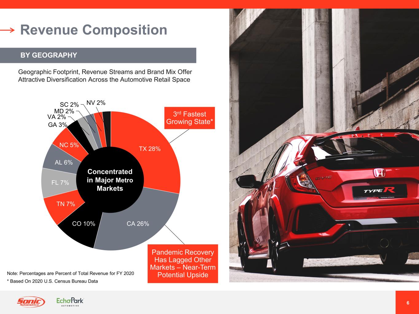 5 Investment Highlights Multiple Growth And Profit Drivers For Franchised Segment Unique, High Return EchoPark Business Model Broad Revenue Stream Diversification Complementary Relationship – Sonic Franchised And EchoPark Disciplined Capital Allocation To Accelerate EchoPark Growth Focused On Expense Control And Strengthening The Balance Sheet Expect To Grow Total Revenue To $25 Billion By 2025 Note: Total revenue projection is estimate of future results. Actual results may differ. See “Forward-Looking Statements.”