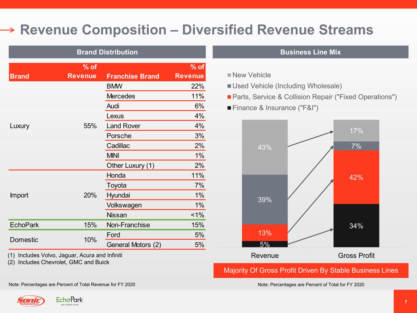 6 Revenue Composition BY GEOGRAPHY TX 28% CA 26%CO 10% TN 7% FL 7% AL 6% NC 5% GA 3% VA 2% MD 2% SC 2% NV 2% Concentrated in Major Metro Markets Geographic Footprint, Revenue Streams and Brand Mix Offer Attractive Diversification Across the Automotive Retail Space Note: Percentages are Percent of Total Revenue for FY 2020 * Based On 2020 U.S. Census Bureau Data 3rd Fastest Growing State* Pandemic Recovery Has Lagged Other Markets – Near-Term Potential Upside