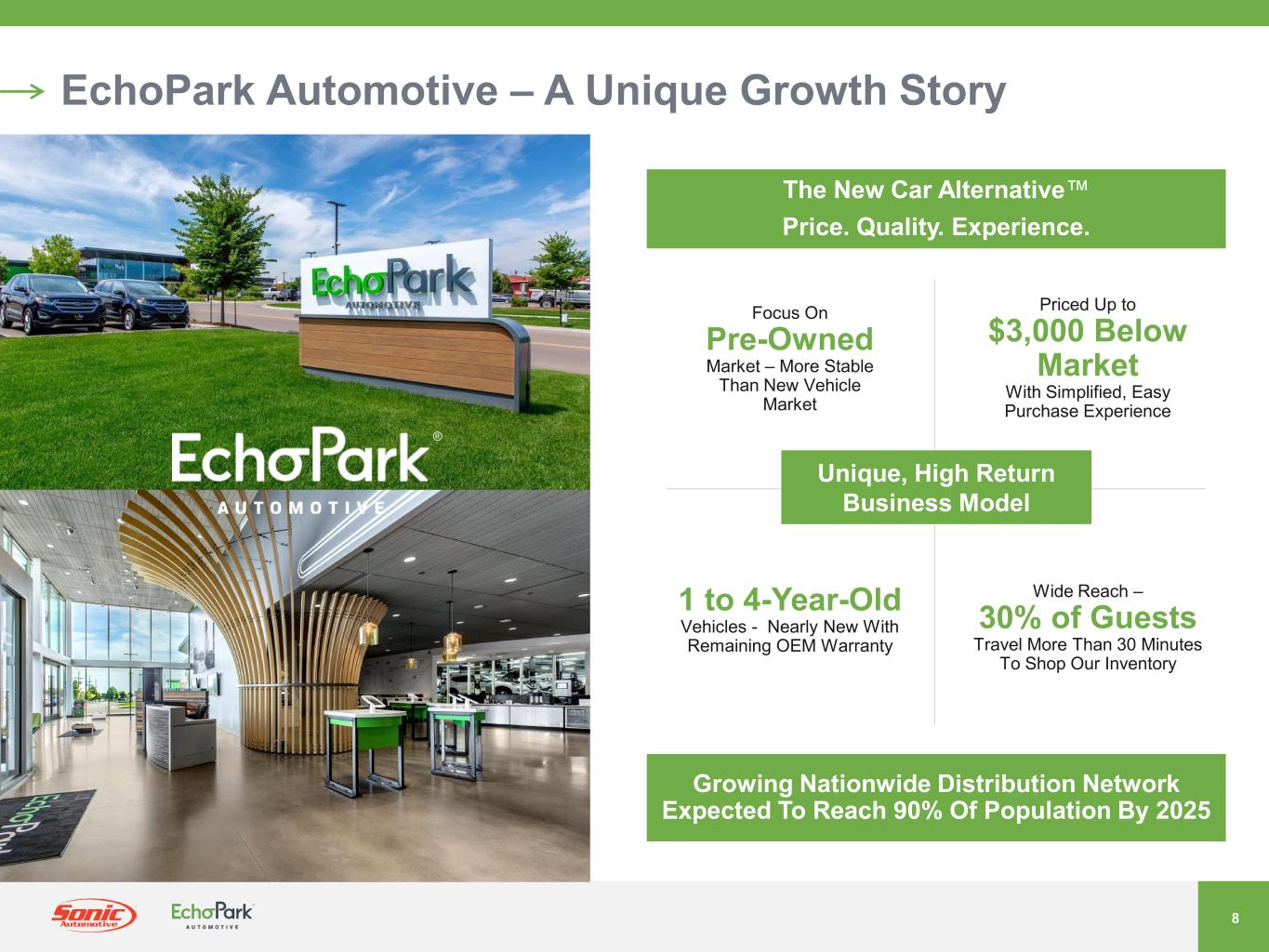 7 Revenue Composition – Diversified Revenue Streams Note: Percentages are Percent of Total for FY 2020 5% 34% 13% 42% 39% 7%43% 17% Revenue Gross Profit New Vehicle Used Vehicle (Including Wholesale) Parts, Service & Collision Repair ("Fixed Operations") Finance & Insurance ("F&I") Brand Distribution Note: Percentages are Percent of Total Revenue for FY 2020 Brand % of Revenue Franchise Brand % of Revenue BMW 22% Mercedes 11% Audi 6% Lexus 4% Land Rover 4% Porsche 3% Cadillac 2% MINI 1% Other Luxury (1) 2% Honda 11% Toyota 7% Hyundai 1% Volkswagen 1% Nissan <1% EchoPark 15% Non-Franchise 15% Ford 5% General Motors (2) 5% Luxury 55% 20%Import Domestic 10% (1) Includes Volvo, Jaguar, Acura and Infiniti (2) Includes Chevrolet, GMC and Buick Business Line Mix Majority Of Gross Profit Driven By Stable Business Lines