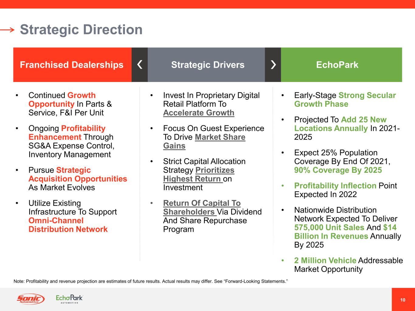 9 Franchised Dealerships ® ® Complementary Relationship Between Segments • Thrives When New Vehicle Industry Is Healthy, Particularly Where Luxury Brands Are Strong • Diversified Revenue Streams • Relatively Low Fixed Costs And Multiple Strategic Levers • Further Growth Opportunities: Parts and Service Business Used Vehicles F&I Penetration Expense Leverage Strategic Acquisitions • Strong Secular Growth Phase Due To: Focus On Recession-Resistant Pre-Owned Vehicle Market Below-Market Pricing Strategy Simplified, Easy Purchase Experience • If Pre-Owned Vehicle Valuations Decline, EchoPark Should: Benefit From Rapid Inventory Turns, Creating An Even Greater Pricing Advantage Over Competitors To Drive Additional Volume