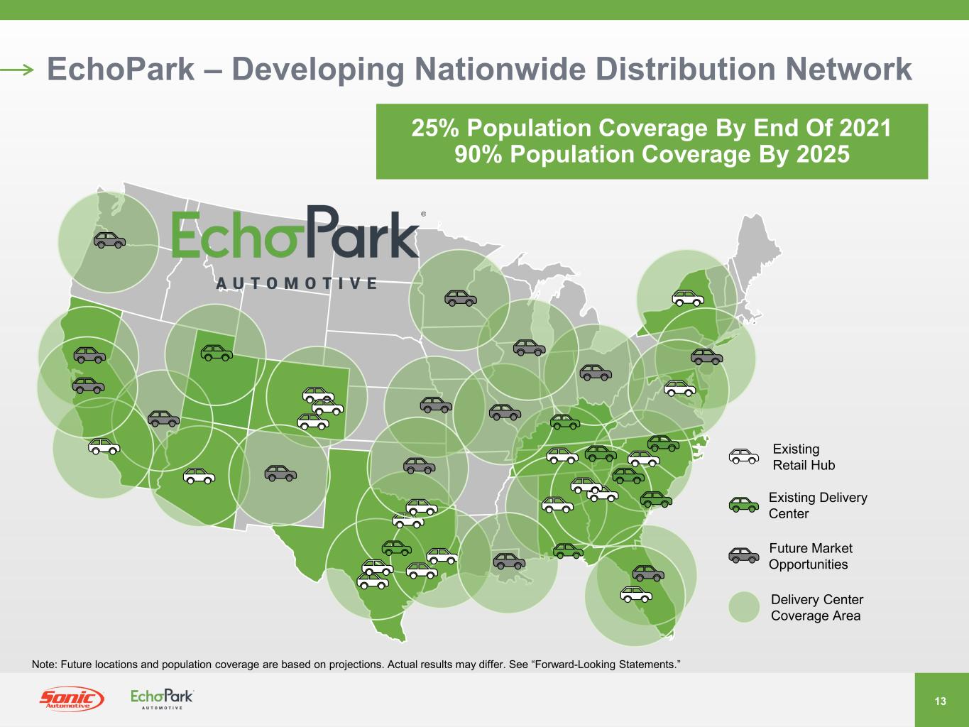 12 EchoPark – Brand Promise Up To 40% Below New Vehicle Price Up To 10% Below Used Vehicle Market Price High Quality, Low Mileage Vehicle With Existing Warranty Transparent Guest-Centric Experience New Car Feel Without The New Car Price Complete Purchase In Under An Hour Zero Reported Accidents On CARFAX Buy & Sell Your Way – On-Site Or Online P r i c e . Q u a l i t y. E x p e r i e n c e . T h e F u l l O m n i - C h a n n e l O p t i o n