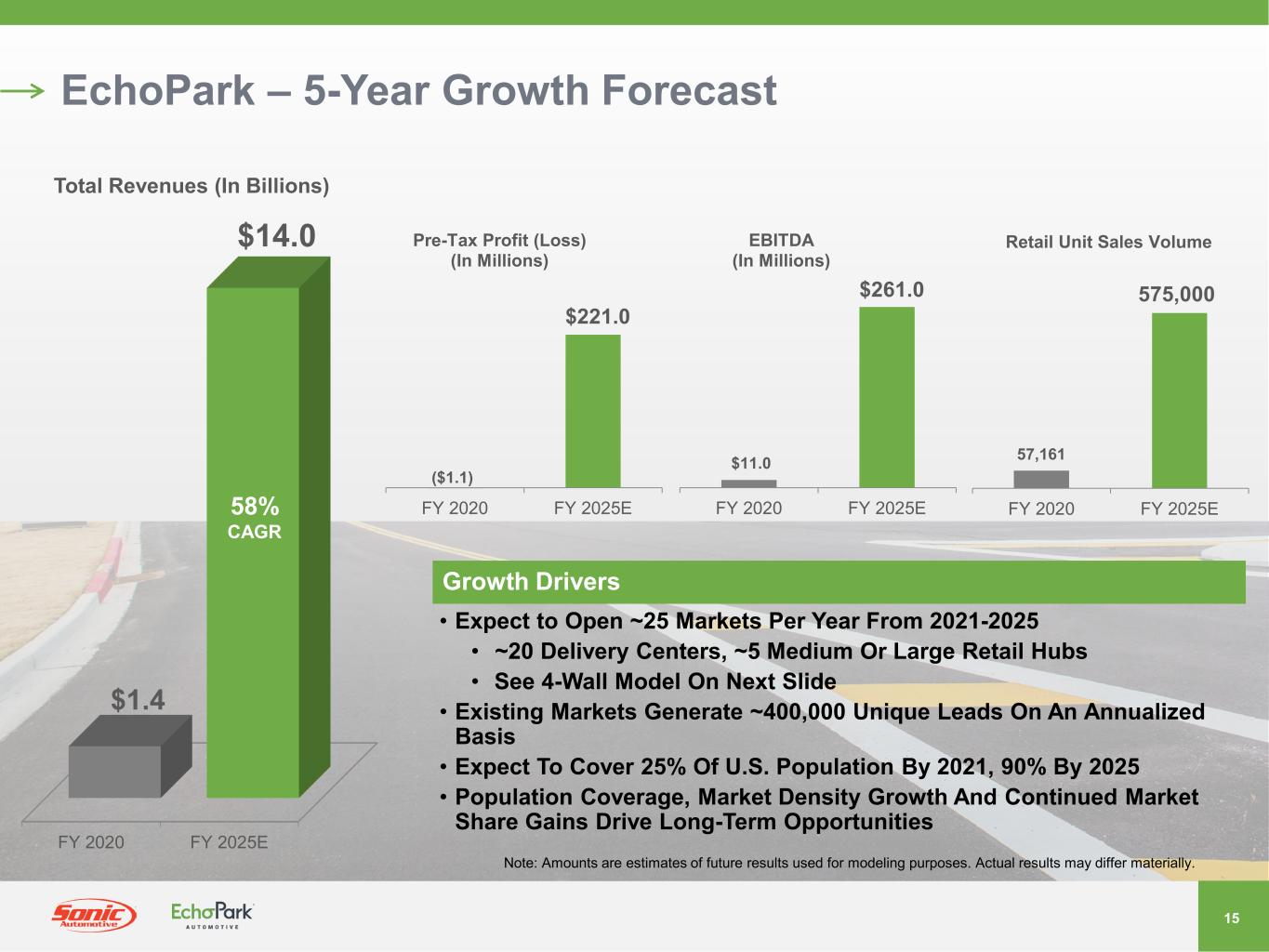 14 EchoPark – Addressable Market Opportunity * Share Of Vehicles That Fit Model In Existing EchoPark Markets Target 90% Population Coverage By 2025 With Growing Nationwide Distribution Network Target 10% Market Share Already Achieving This Share* In Multiple Markets Priced Up to $3,000 Below Used Compete On Price Vs. 5–6- Year-Old Vehicles, Consumer Can Buy Newer Vehicle At Same Price Priced Up To 40% Below New Attract Prospective New Car Buyers 2 MILLION Opportunity 15+ MILLION 1–4-Year-Old Vehicles 6+ MILLION 5–6-Year- Old Vehicles 13+ MILLION New Vehicles 5% Q2 2021 Average Market Share* – Up 90 Basis Points From Q2 2020 Annual Retail Vehicle Sales Volume