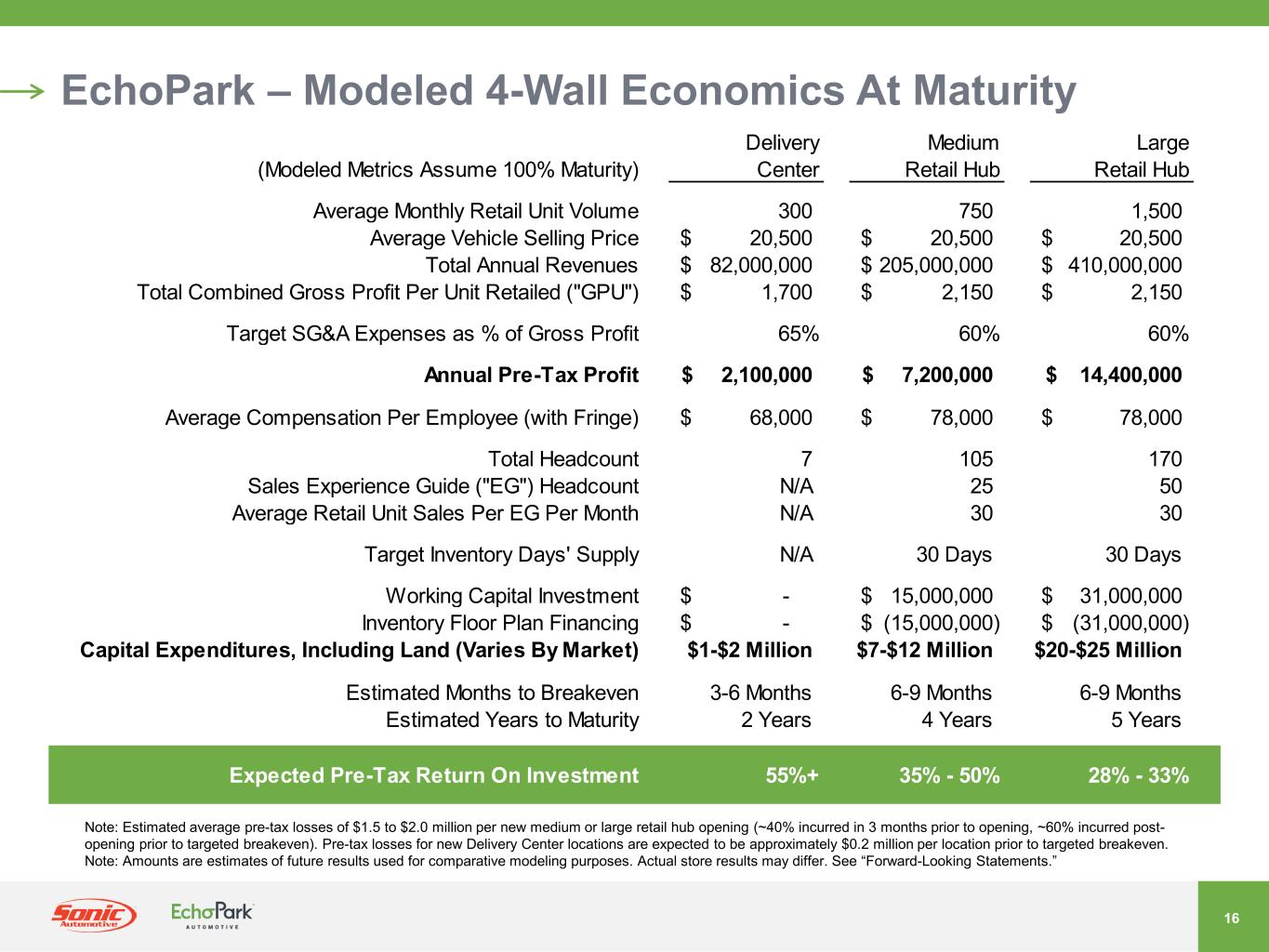 15 EchoPark – 5-Year Growth Forecast 57,161 575,000 FY 2020 FY 2025E Retail Unit Sales Volume FY 2020 FY 2025E $1.4 $14.0 Total Revenues (In Billions) 58% CAGR $221.0 FY 2020 FY 2025E Pre-Tax Profit (Loss) (In Millions) ($1.1) $11.0 $261.0 FY 2020 FY 2025E EBITDA (In Millions) Growth Drivers • Expect to Open ~25 Markets Per Year From 2021-2025 • ~20 Delivery Centers, ~5 Medium Or Large Retail Hubs • See 4-Wall Model On Next Slide • Existing Markets Generate ~400,000 Unique Leads On An Annualized Basis • Expect To Cover 25% Of U.S. Population By 2021, 90% By 2025 • Population Coverage, Market Density Growth And Continued Market Share Gains Drive Long-Term Opportunities Note: Amounts are estimates of future results used for modeling purposes. Actual results may differ materially.