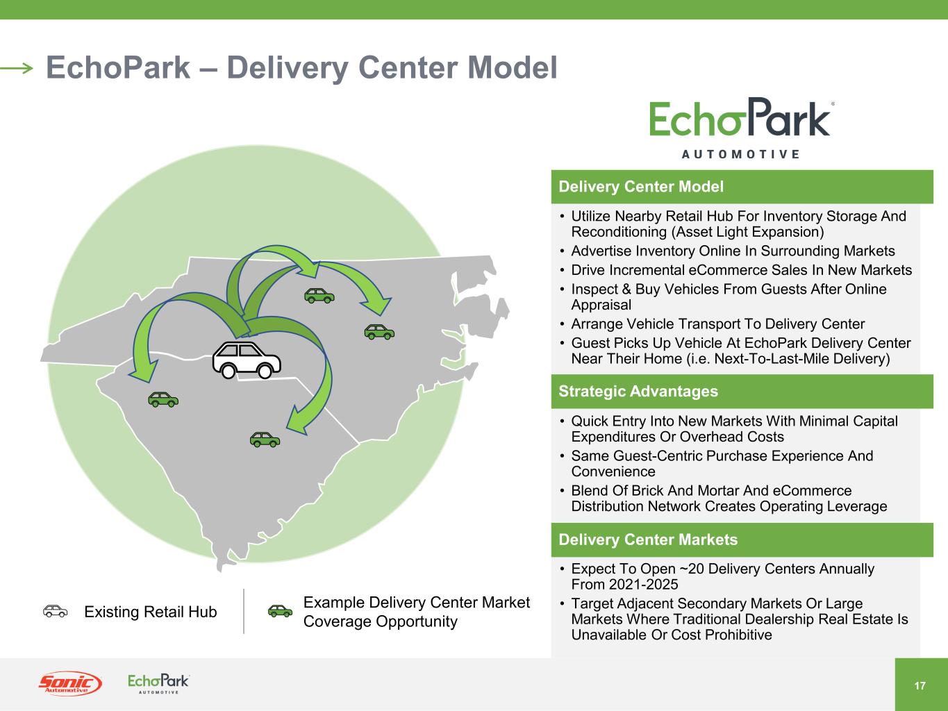 16 EchoPark – Modeled 4-Wall Economics At Maturity (Modeled Metrics Assume 100% Maturity) Delivery Center Medium Retail Hub Large Retail Hub Average Monthly Retail Unit Volume 300 750 1,500 Average Vehicle Selling Price 20,500$ 20,500$ 20,500$ Total Annual Revenues 82,000,000$ 205,000,000$ 410,000,000$ Total Combined Gross Profit Per Unit Retailed ("GPU") 1,700$ 2,150$ 2,150$ Target SG&A Expenses as % of Gross Profit 65% 60% 60% Annual Pre-Tax Profit 2,100,000$ 7,200,000$ 14,400,000$ Average Compensation Per Employee (with Fringe) 68,000$ 78,000$ 78,000$ Total Headcount 7 105 170 Sales Experience Guide ("EG") Headcount N/A 25 50 Average Retail Unit Sales Per EG Per Month N/A 30 30 Target Inventory Days' Supply N/A 30 Days 30 Days Working Capital Investment -$ 15,000,000$ 31,000,000$ Inventory Floor Plan Financing -$ (15,000,000)$ (31,000,000)$ Capital Expenditures, Including Land (Varies By Market) $1-$2 Million $7-$12 Million $20-$25 Million Estimated Months to Breakeven 3-6 Months 6-9 Months 6-9 Months Estimated Years to Maturity 2 Years 4 Years 5 Years Expected Pre-Tax Return On Investment 55%+ 35% - 50% 28% - 33% Note: Estimated average pre-tax losses of $1.5 to $2.0 million per new medium or large retail hub opening (~40% incurred in 3 months prior to opening, ~60% incurred post- opening prior to targeted breakeven). Pre-tax losses for new Delivery Center locations are expected to be approximately $0.2 million per location prior to targeted breakeven. Note: Amounts are estimates of future results used for comparative modeling purposes. Actual store results may differ. See “Forward-Looking Statements.”