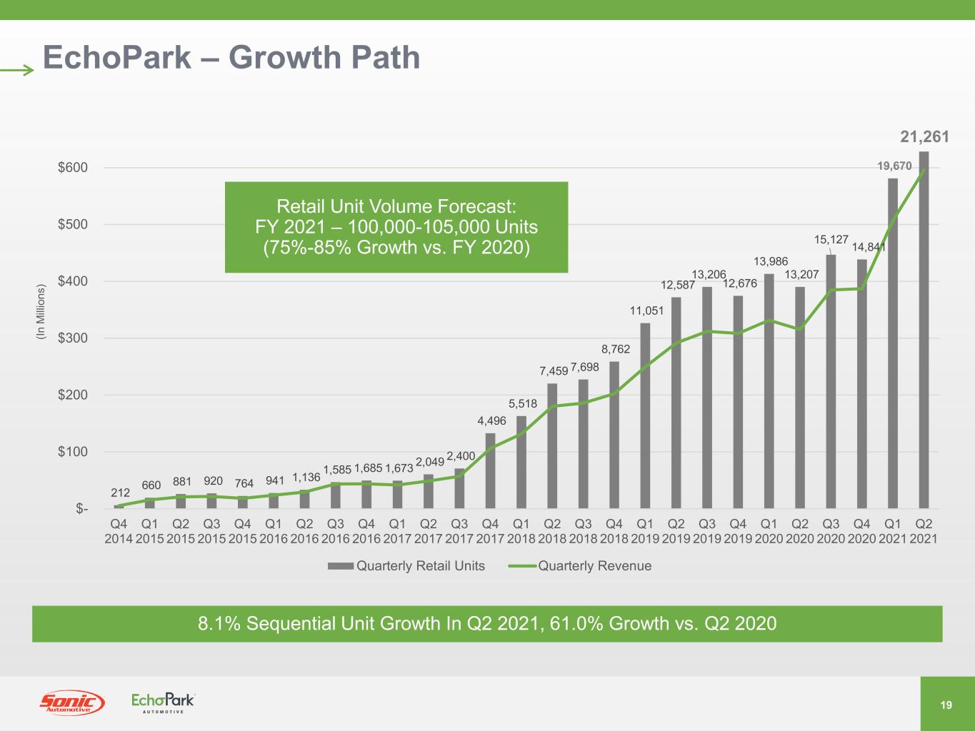 18 EchoPark – High Volume Model Drives Superior Returns Gross Profit Per Unit (“GPU”) Franchised Used EchoPark Better (Worse) Front-End Used Vehicle GPU $1,300 $(100) F&I GPU $1,600 $2,250 Parts and Service Reconditioning GPU $500 - Total Used-Related GPU $3,400 $2,150 ($1,250) Volume Differential Factor x1 X5 Pro Forma Comparative Used-Related Gross Profit $3,400 $10,750 $7,350 Ultra-Low Pricing Attractive F&I High Volume Throughput Below-Market Pricing Drives High Customer Lead Volume Higher Penetration Rates On F&I Products vs. Sonic Franchised Stores 5X Volume Throughput Per Retail Hub vs. Sonic Franchised Stores Note: Amounts are estimates of future results used for comparative modeling purposes. Actual results may differ.