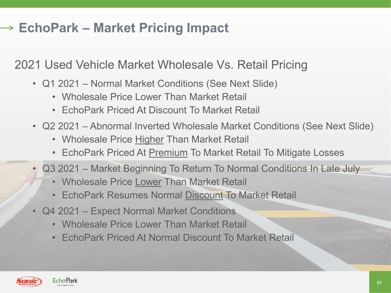 21 EchoPark – Market Pricing Impact 2021 Used Vehicle Market Wholesale Vs. Retail Pricing • Q1 2021 – Normal Market Conditions (See Next Slide) • Wholesale Price Lower Than Market Retail • EchoPark Priced At Discount To Market Retail • Q2 2021 – Abnormal Inverted Wholesale Market Conditions (See Next Slide) • Wholesale Price Higher Than Market Retail • EchoPark Priced At Premium To Market Retail To Mitigate Losses • Q3 2021 – Market Beginning To Return To Normal Conditions In Late July • Wholesale Price Lower Than Market Retail • EchoPark Resumes Normal Discount To Market Retail • Q4 2021 – Expect Normal Market Conditions • Wholesale Price Lower Than Market Retail • EchoPark Priced At Normal Discount To Market Retail