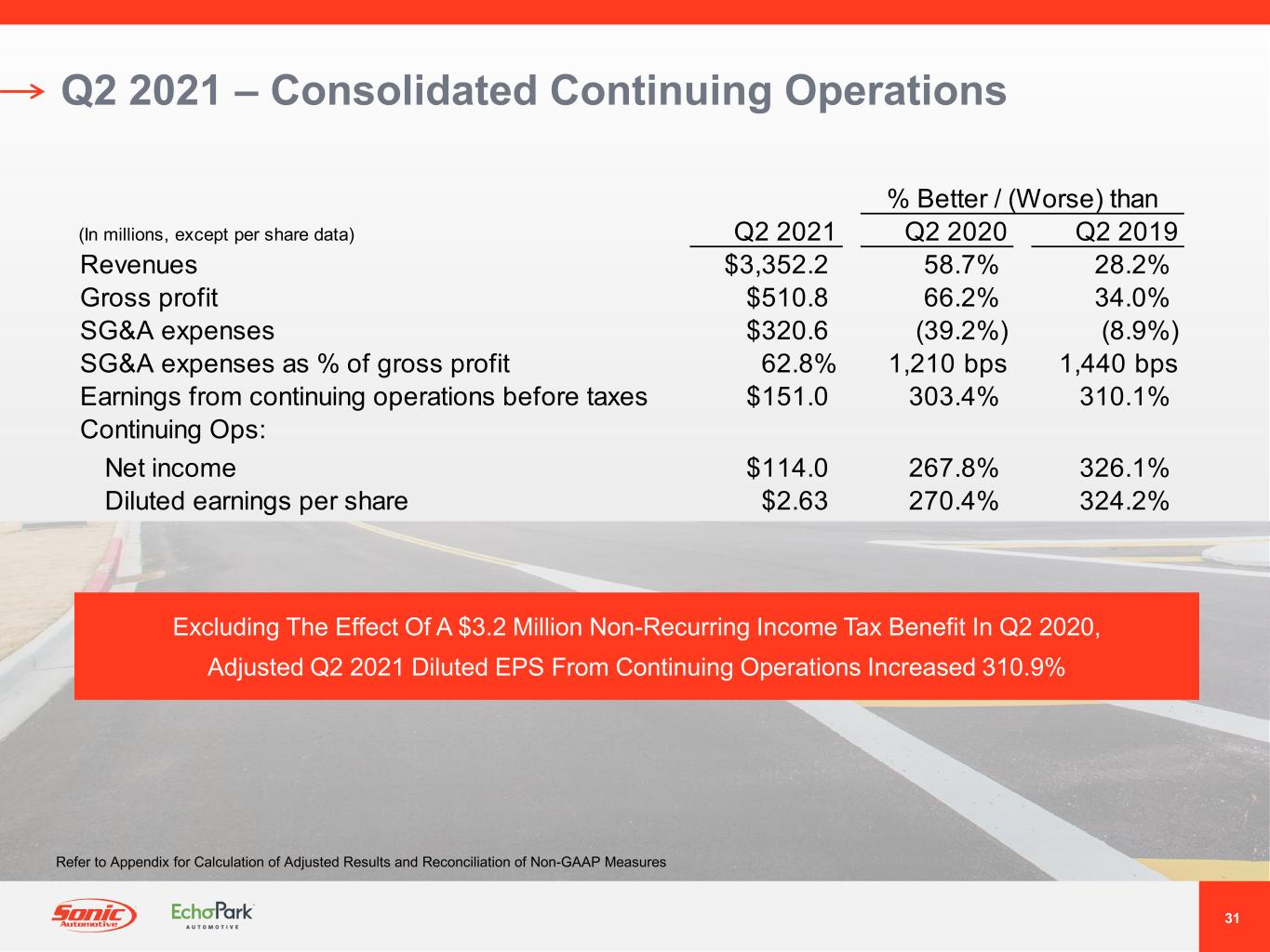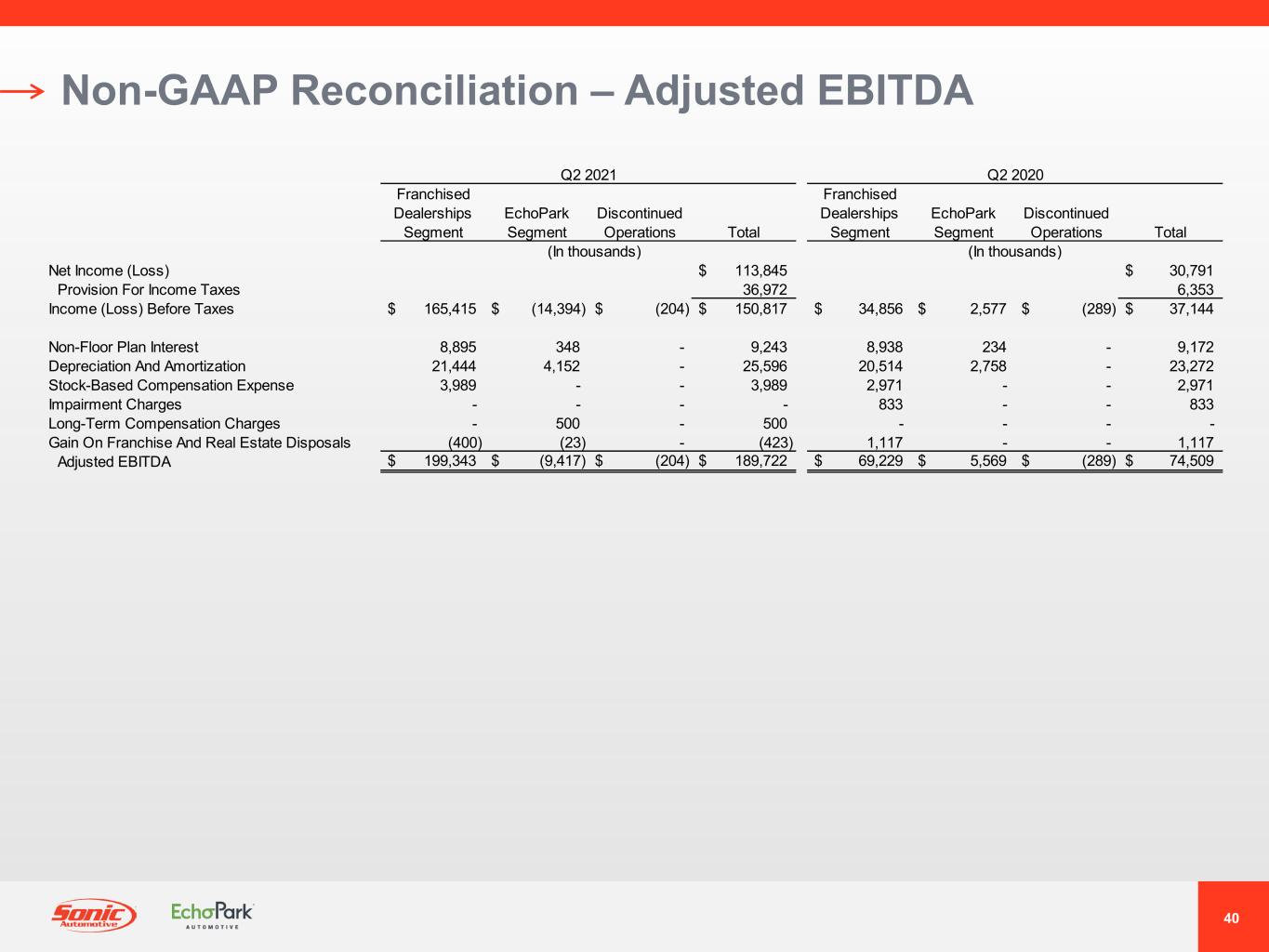 40 Non-GAAP Reconciliation – Adjusted EBITDA Franchised Dealerships Segment EchoPark Segment Discontinued Operations Total Franchised Dealerships Segment EchoPark Segment Discontinued Operations Total (In thousands) (In thousands) Net Income (Loss) $ 113,845 $ 30,791 Provision For Income Taxes 36,972 6,353 Income (Loss) Before Taxes $ 165,415 $ (14,394) $ (204) $ 150,817 $ 34,856 $ 2,577 $ (289) $ 37,144 Non-Floor Plan Interest 8,895 348 - 9,243 8,938 234 - 9,172 Depreciation And Amortization 21,444 4,152 - 25,596 20,514 2,758 - 23,272 Stock-Based Compensation Expense 3,989 - - 3,989 2,971 - - 2,971 Impairment Charges - - - - 833 - - 833 Long-Term Compensation Charges - 500 - 500 - - - - Gain On Franchise And Real Estate Disposals (400) (23) - (423) 1,117 - - 1,117 Adjusted EBITDA $ 199,343 $ (9,417) $ (204) $ 189,722 $ 69,229 $ 5,569 $ (289) $ 74,509 Q2 2021 Q2 2020