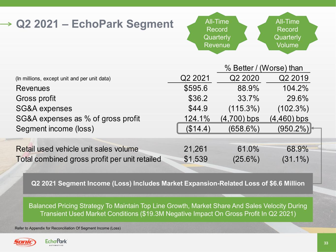 32 Q2 2021 – Franchised Dealerships Segment % Better / (Worse) than (In millions, except unit and per unit data) Q2 2021 Q2 2020 Q2 2019 Revenues $2,756.6 53.4% 18.7% Gross profit $474.6 69.3% 34.3% SG&A expenses $275.7 (31.6%) (1.2%) SG&A expenses as % of gross profit 58.1% 1,660 bps 1,900 bps Segment income (loss) $165.4 363.5% 370.9% New vehicle unit sales volume 30,488 53.3% 8.1% Retail used vehicle unit sales volume 28,550 19.1% (1.1%) New vehicle gross profit per unit $3,881 70.1% 94.0% Retail used vehicle gross profit per unit $1,934 52.4% 49.1% F&I gross profit per unit retailed $2,110 14.7% 33.5% Excluding The Effect Of Disposals In 2019, Same Store Q2 2021 New Unit Volume Increased 17.6% And Retail Used Unit Volume Increased 6.6% Compared to Q2 2019 Refer to Appendix for Reconciliation Of Segment Income (Loss)