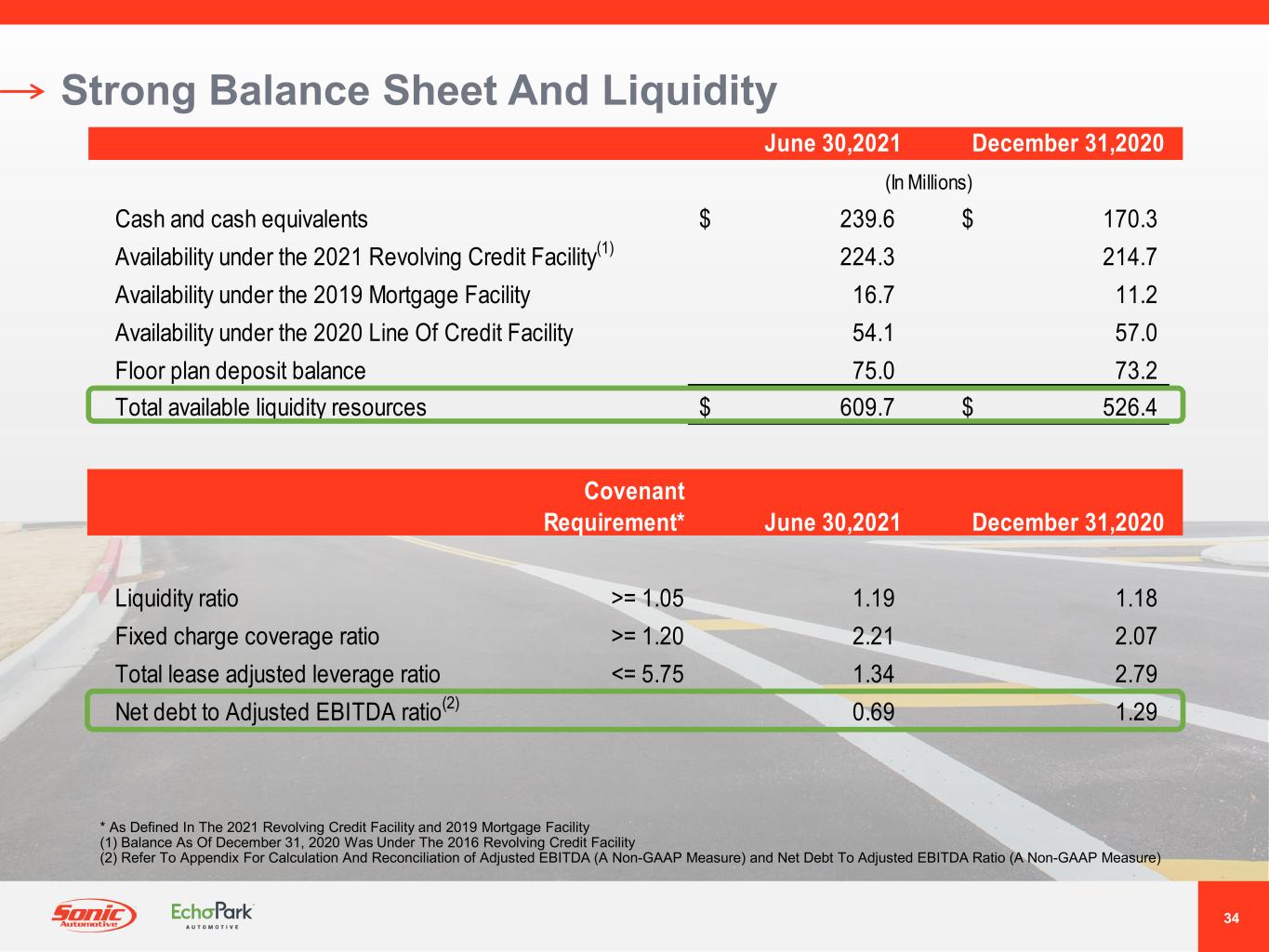 33 Q2 2021 – EchoPark Segment % Better / (Worse) than (In millions, except unit and per unit data) Q2 2021 Q2 2020 Q2 2019 Revenues $595.6 88.9% 104.2% Gross profit $36.2 33.7% 29.6% SG&A expenses $44.9 (115.3%) (102.3%) SG&A expenses as % of gross profit 124.1% (4,700) bps (4,460) bps Segment income (loss) ($14.4) (658.6%) (950.2%) Retail used vehicle unit sales volume 21,261 61.0% 68.9% Total combined gross profit per unit retailed $1,539 (25.6%) (31.1%) All-Time Record Quarterly Volume Q2 2021 Segment Income (Loss) Includes Market Expansion-Related Loss of $6.6 Million All-Time Record Quarterly Revenue Balanced Pricing Strategy To Maintain Top Line Growth, Market Share And Sales Velocity During Transient Used Market Conditions ($19.3M Negative Impact On Gross Profit In Q2 2021) Refer to Appendix for Reconciliation Of Segment Income (Loss)