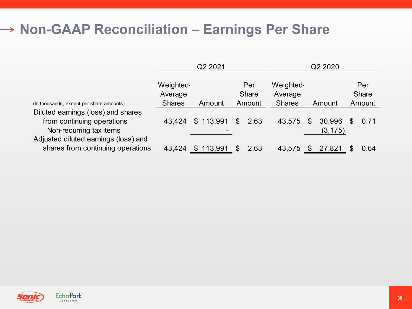 37 Non-GAAP Reconciliation – Segment Income Franchised Dealerships Segment EchoPark Segment Consolidated (In millions, except unit data) Q2 2021 Q2 2020 Q2 2021 Q2 2020 Q2 2021 Q2 2020 Revenues 2,756.6$ 1,796.6$ 595.6$ 315.3$ 3,352.2$ 2,111.9$ Gross profit 474.6$ 280.3$ 36.2$ 27.1$ 510.8$ 307.4$ SG&A expenses 275.7$ 209.5$ 44.9$ 20.9$ 320.6$ 230.4$ Segment income 165.4$ 35.7$ (14.4)$ 2.6$ 151.0$ 38.3$ Impairment charges - (0.8) - - - (0.8) Earnings (loss) from continuing operations before taxes 165.4$ 34.9$ (14.4)$ 2.6$ 151.0$ 37.5$ Adjusted net income (loss) from continuing operations 114.0$ 27.8$ Impairment charges (before taxes) - - Tax effect of items of interest and non-recurring tax items - 3.2 Net income (loss) from continuing operations 114.0$ 31.0$ New vehicle unit sales volume 30,488 19,891 14 - 30,502 19,891 Retail used vehicle unit sales volume 28,550 23,973 21,261 13,207 49,811 37,180 Note: Segment Income (Loss) Defined As Earnings (Loss) From Continuing Operations Before Taxes And Impairment Charges