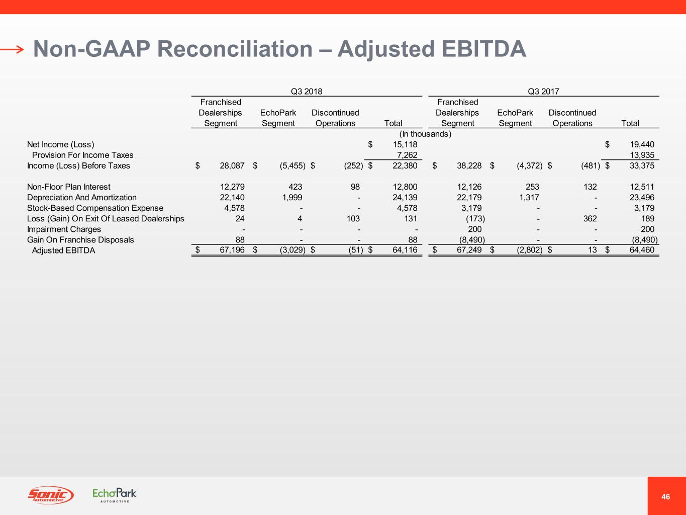 45 Non-GAAP Reconciliation – Adjusted EBITDA Franchised Dealerships Segment EchoPark Segment Discontinued Operations Total Franchised Dealerships Segment EchoPark Segment Discontinued Operations Total (In thousands) Net Income (Loss) $ 42,221 $ (2,194) Provision For Income Taxes 18,935 (1,910) Income (Loss) Before Taxes $ 61,156 $ 180 $ (180) $ 61,156 $ 10,830 $ (14,686) $ (248) $ (4,104) Non-Floor Plan Interest 11,829 433 - 12,262 12,469 389 115 12,973 Depreciation And Amortization 20,824 2,418 - 23,242 22,830 1,666 - 24,496 Stock-Based Compensation Expense 2,814 - - 2,814 2,962 - - 2,962 Loss (Gain) On Exit Of Leased Dealerships (170) - - (170) 4,955 7 109 5,071 Impairment Charges 26 1,926 - 1,952 3,561 82 - 3,643 Long-Term Compensation Charges - - - - - 9,189 - 9,189 Gain On Franchise Disposals (46,750) - - (46,750) (1,190) - - (1,190) Adjusted EBITDA $ 49,729 $ 4,957 $ (180) $ 54,506 $ 56,417 $ (3,353) $ (24) $ 53,040 Franchised Dealerships Segment EchoPark Segment Discontinued Operations Total Franchised Dealerships Segment EchoPark Segment Discontinued Operations Total (In thousands) Net Income (Loss) $ 21,821 $ 61,952 Provision For Income Taxes 9,150 (8,399) Income (Loss) Before Taxes $ 37,388 $ (6,196) $ (221) $ 30,971 $ 57,822 $ (3,976) $ (293) $ 53,553 Non-Floor Plan Interest 12,902 423 89 13,414 12,449 276 123 12,848 Depreciation And Amortization 21,086 2,211 - 23,297 22,639 1,314 - 23,953 Stock-Based Compensation Expense 1,264 - - 1,264 2,217 - - 2,217 Loss (Gain) On Exit Of Leased Dealerships (1,080) 3 89 (988) 23 - 118 141 Impairment Charges 14,053 1,500 - 15,553 6,079 - - 6,079 Long-Term Compensation Charges - - - - - 1,271 - 1,271 Gain On Franchise Disposals (158) - - (158) (1,507) - (6) (1,513) Adjusted EBITDA $ 85,455 $ (2,059) $ (43) $ 83,353 $ 99,722 $ (1,115) $ (58) $ 98,549 Q1 2019 Q1 2018 Q4 2018 Q4 2017