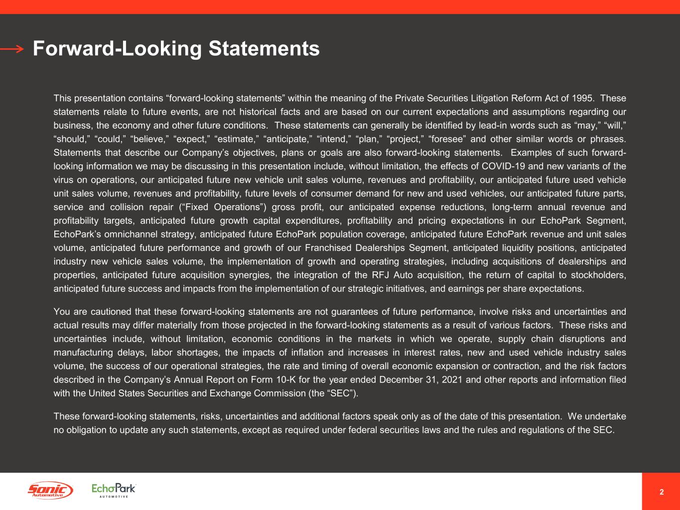 2 Forward-Looking Statements This presentation contains “forward-looking statements” within the meaning of the Private Securities Litigation Reform Act of 1995. These statements relate to future events, are not historical facts and are based on our current expectations and assumptions regarding our business, the economy and other future conditions. These statements can generally be identified by lead-in words such as “may,” “will,” “should,” “could,” “believe,” “expect,” “estimate,” “anticipate,” “intend,” “plan,” “project,” “foresee” and other similar words or phrases. Statements that describe our Company’s objectives, plans or goals are also forward-looking statements. Examples of such forward- looking information we may be discussing in this presentation include, without limitation, the effects of COVID-19 and new variants of the virus on operations, our anticipated future new vehicle unit sales volume, revenues and profitability, our anticipated future used vehicle unit sales volume, revenues and profitability, future levels of consumer demand for new and used vehicles, our anticipated future parts, service and collision repair (“Fixed Operations”) gross profit, our anticipated expense reductions, long-term annual revenue and profitability targets, anticipated future growth capital expenditures, profitability and pricing expectations in our EchoPark Segment, EchoPark’s omnichannel strategy, anticipated future EchoPark population coverage, anticipated future EchoPark revenue and unit sales volume, anticipated future performance and growth of our Franchised Dealerships Segment, anticipated liquidity positions, anticipated industry new vehicle sales volume, the implementation of growth and operating strategies, including acquisitions of dealerships and properties, anticipated future acquisition synergies, the integration of the RFJ Auto acquisition, the return of capital to stockholders, anticipated future success and impacts from the implementation of our strategic initiatives, and earnings per share expectations. You are cautioned that these forward-looking statements are not guarantees of future performance, involve risks and uncertainties and actual results may differ materially from those projected in the forward-looking statements as a result of various factors. These risks and uncertainties include, without limitation, economic conditions in the markets in which we operate, supply chain disruptions and manufacturing delays, labor shortages, the impacts of inflation and increases in interest rates, new and used vehicle industry sales volume, the success of our operational strategies, the rate and timing of overall economic expansion or contraction, and the risk factors described in the Company’s Annual Report on Form 10-K for the year ended December 31, 2021 and other reports and information filed with the United States Securities and Exchange Commission (the “SEC”). These forward-looking statements, risks, uncertainties and additional factors speak only as of the date of this presentation. We undertake no obligation to update any such statements, except as required under federal securities laws and the rules and regulations of the SEC.