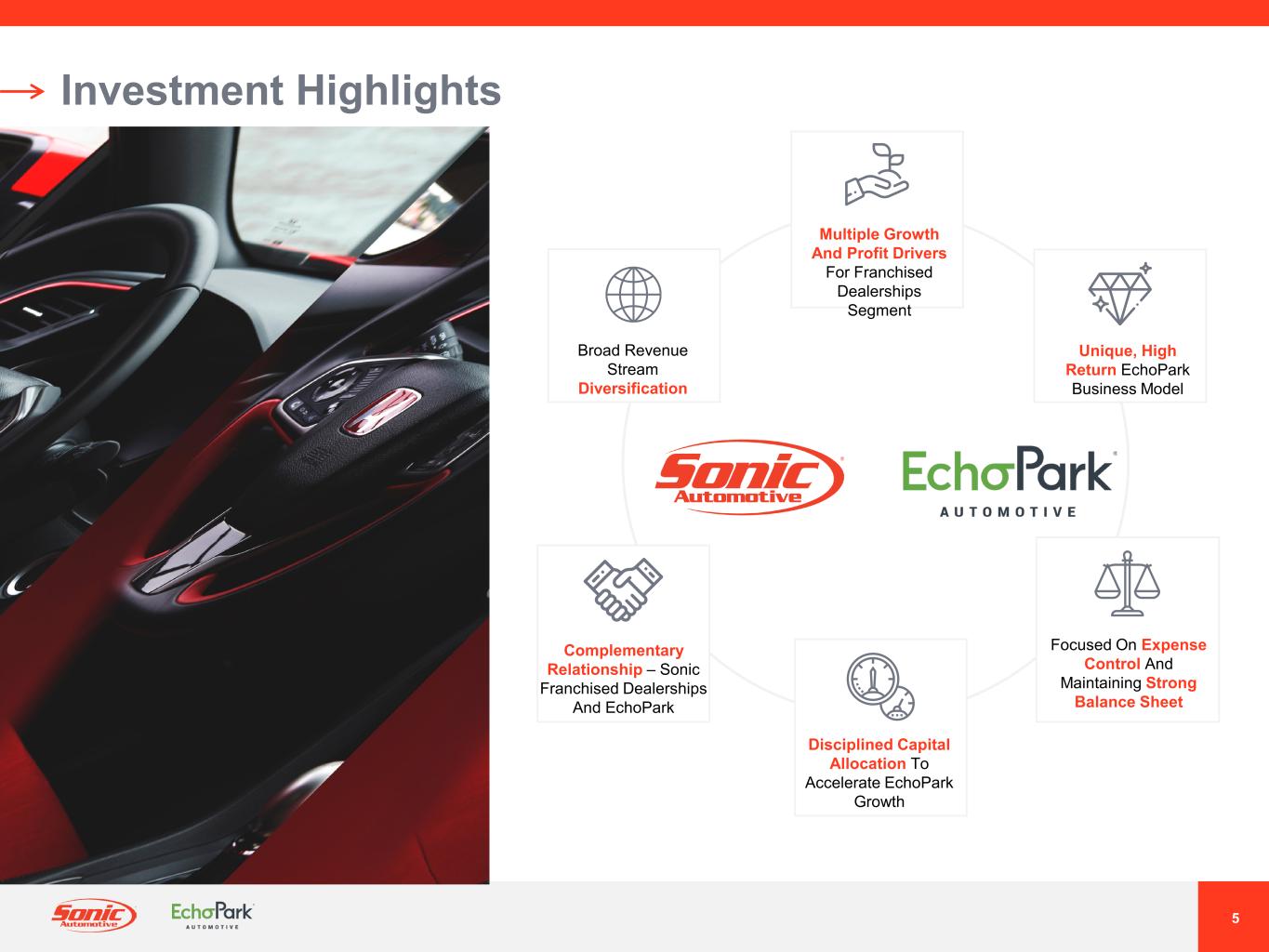 4 ® Sonic Automotive: Who We Are QUICK FACTS (NYSE: SAH) a Fortune 500 Company and One of the Nation’s Largest Automotive Retailers 161 25+ 23 17 $12.4 Billion $1.9 Billion 103K New Vehicles Sold 183K Total Revenues Automotive Brands Locations Used Vehicles Sold Collision Centers States Gross Profit Note: Location Counts As Of July 28, 2022. Revenues, Gross Profit, New & Used Vehicles Sold are for FY 2021 Our Core Franchised Dealerships Segment is a Full-Service Automotive Retail Business With Strategic Growth Levers Across Multiple Business Lines with a Diversified Brand Portfolio Our High Growth EchoPark Segment Offers a Unique Approach to Pre-Owned Vehicle and F&I Sales Below-Market Pricing with a No Haggle Purchase Experience Drives Industry-Leading Used Vehicle Volume Throughput