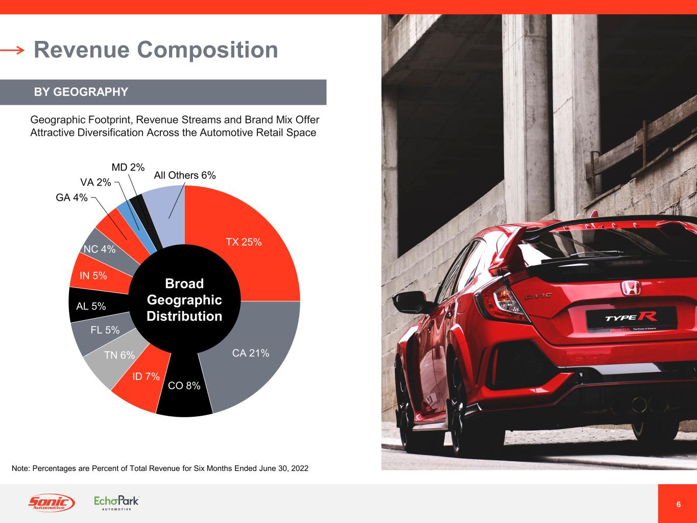 5 Investment Highlights Multiple Growth And Profit Drivers For Franchised Dealerships Segment Unique, High Return EchoPark Business Model Broad Revenue Stream Diversification Complementary Relationship – Sonic Franchised Dealerships And EchoPark Disciplined Capital Allocation To Accelerate EchoPark Growth Focused On Expense Control And Maintaining Strong Balance Sheet