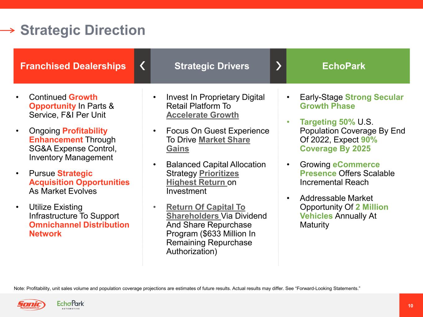 9 Franchised Dealerships ® ® Complementary Relationship Between Segments • Thrives When New Vehicle Industry Is Healthy, Particularly Where Luxury Brands Are Strong • Diversified Revenue Streams • Relatively Low Fixed Costs And Multiple Strategic Levers • Further Growth Opportunities: Parts And Service Business Used Vehicles F&I Penetration Expense Leverage Strategic Acquisitions • Strong Secular Growth Phase Due To: Focus On Highly Fragmented Pre-Owned Vehicle Market Below-Market Pricing Strategy Simplified, Easy Purchase Experience • In A Declining Pre-Owned Vehicle Price Environment, EchoPark Should: Benefit From Rapid Inventory Turns, Creating An Even Greater Pricing Advantage Over Competitors To Drive Additional Unit Sales Volume