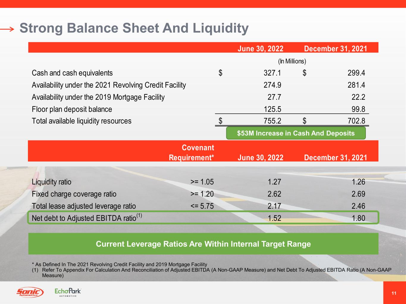 10 Strategic Direction • Continued Growth Opportunity In Parts & Service, F&I Per Unit • Ongoing Profitability Enhancement Through SG&A Expense Control, Inventory Management • Pursue Strategic Acquisition Opportunities As Market Evolves • Utilize Existing Infrastructure To Support Omnichannel Distribution Network • Early-Stage Strong Secular Growth Phase • Targeting 50% U.S. Population Coverage By End Of 2022, Expect 90% Coverage By 2025 • Growing eCommerce Presence Offers Scalable Incremental Reach • Addressable Market Opportunity Of 2 Million Vehicles Annually At Maturity • Invest In Proprietary Digital Retail Platform To Accelerate Growth • Focus On Guest Experience To Drive Market Share Gains • Balanced Capital Allocation Strategy Prioritizes Highest Return on Investment • Return Of Capital To Shareholders Via Dividend And Share Repurchase Program ($633 Million In Remaining Repurchase Authorization) Franchised Dealerships EchoParkStrategic Drivers Note: Profitability, unit sales volume and population coverage projections are estimates of future results. Actual results may differ. See “Forward-Looking Statements.”