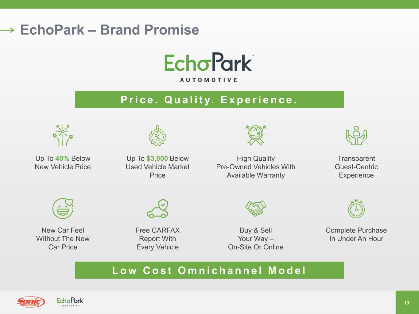 13 EchoPark – Brand Promise Up To 40% Below New Vehicle Price Up To $3,000 Below Used Vehicle Market Price High Quality Pre-Owned Vehicles With Available Warranty Transparent Guest-Centric Experience New Car Feel Without The New Car Price Complete Purchase In Under An Hour Free CARFAX Report With Every Vehicle Buy & Sell Your Way – On-Site Or Online P r i c e . Q u a l i t y. E x p e r i e n c e . L o w C o s t O m n i c h a n n e l M o d e l