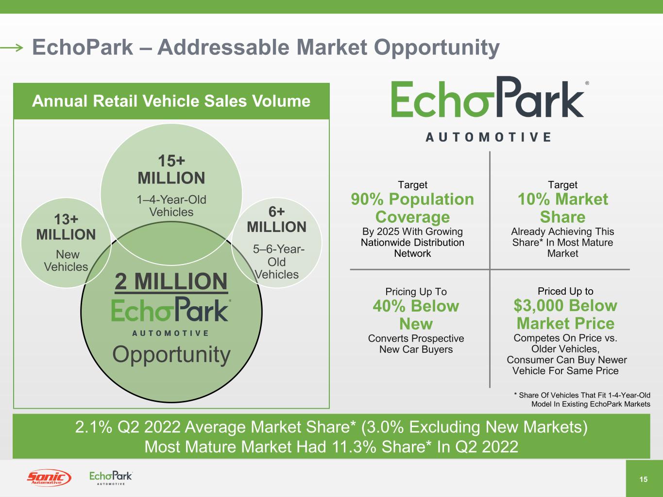 14 EchoPark – Developing Nationwide Distribution Network Approaching 50% Population Coverage To Date Target 90% Population Coverage By 2025 Note: Future locations and U.S. population coverage are based on projections. Actual results may differ. See “Forward-Looking Statements.” Existing Delivery Center Future Delivery Center Coverage Area Existing Retail Hub Future Market Opportunities