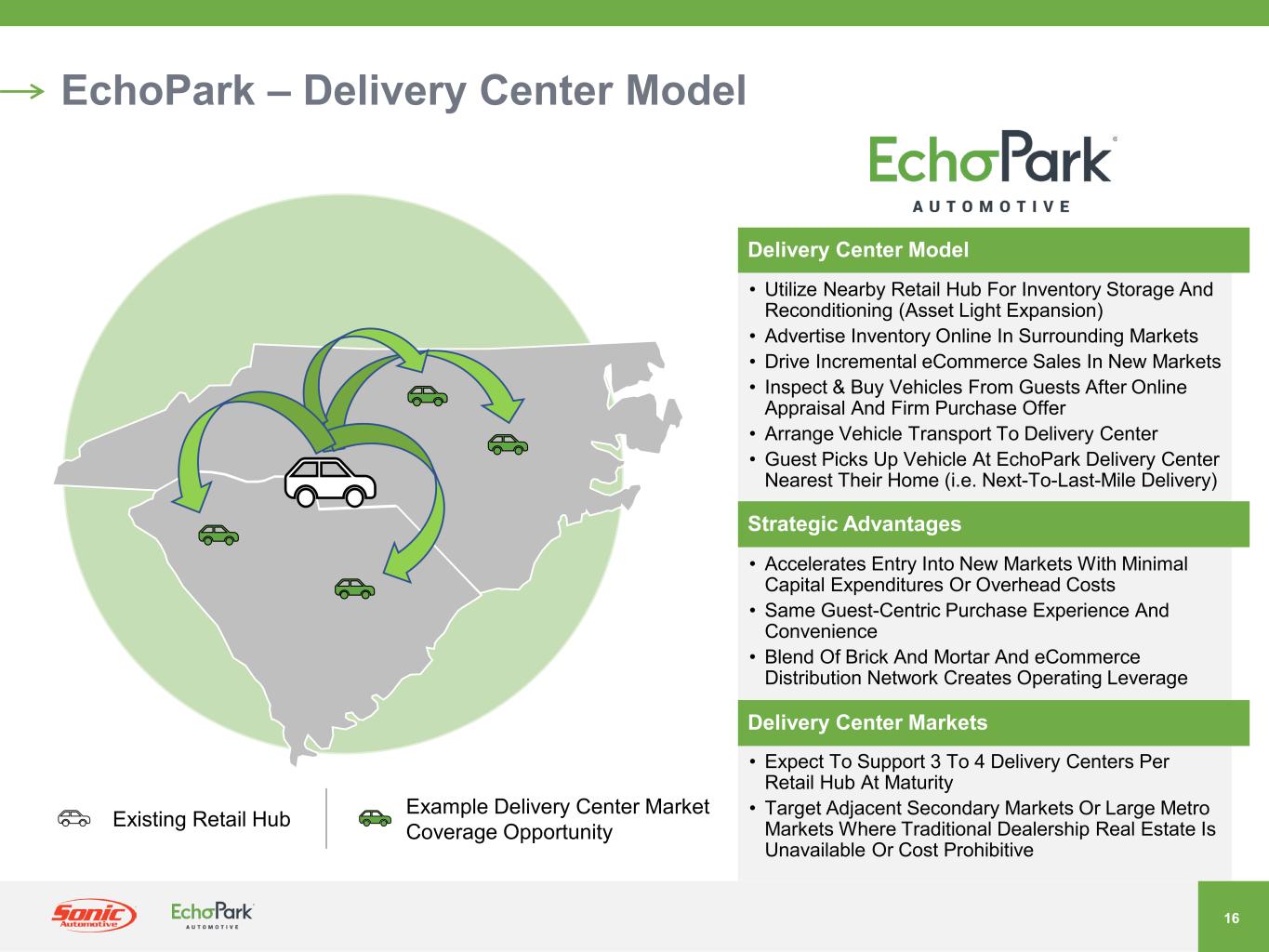 15 EchoPark – Addressable Market Opportunity * Share Of Vehicles That Fit 1-4-Year-Old Model In Existing EchoPark Markets Target 90% Population Coverage By 2025 With Growing Nationwide Distribution Network Target 10% Market Share Already Achieving This Share* In Most Mature Market Priced Up to $3,000 Below Market Price Competes On Price vs. Older Vehicles, Consumer Can Buy Newer Vehicle For Same Price Pricing Up To 40% Below New Converts Prospective New Car Buyers 2 MILLION Opportunity 15+ MILLION 1–4-Year-Old Vehicles 6+ MILLION 5–6-Year- Old Vehicles 13+ MILLION New Vehicles 2.1% Q2 2022 Average Market Share* (3.0% Excluding New Markets) Most Mature Market Had 11.3% Share* In Q2 2022 Annual Retail Vehicle Sales Volume