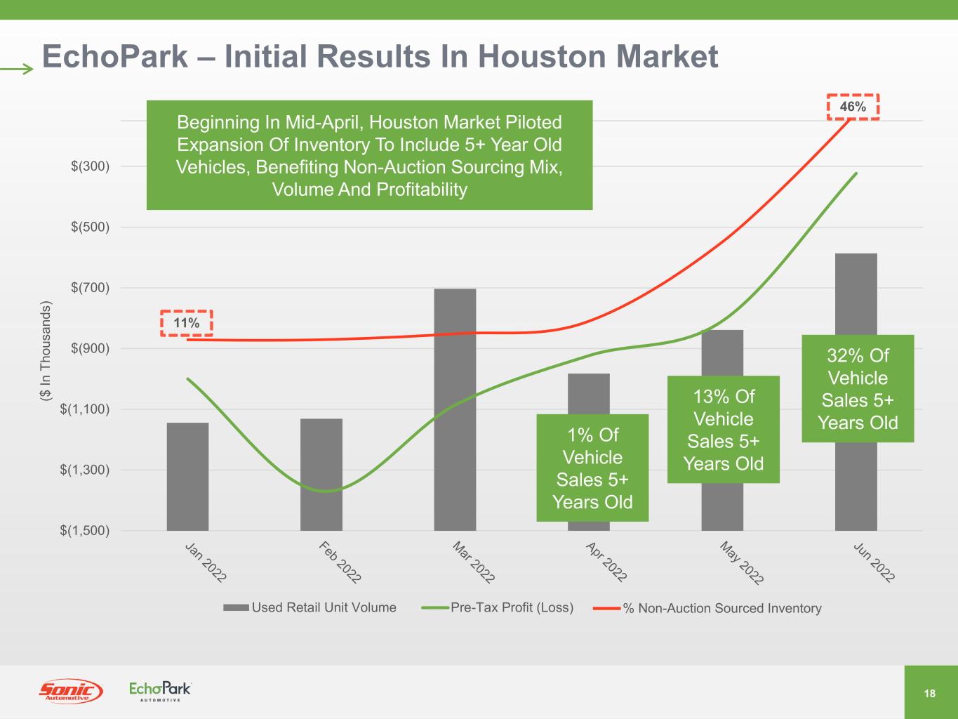 17 EchoPark – Industry Headwinds & Action Plan Industry Headwinds • Supply Chain Disruption Continues To Suppress New Vehicle Production And Inventory Levels, Increasing Demand For Used Vehicles At Auction • Rental Car Companies Cannot Source Sufficient New Vehicles Directly, Turned To Used Vehicle Auction Market To Supply Their Fleet, Driving Used Vehicle Prices To All-Time Highs • Used Price As A Percentage Of New Price At Nearly 70% (Typically In 55-60% Range) Negatively Impacts Affordability • July To Date, 3-Year Old Vehicle Manheim Prices Decreased 3.0%, Auction “No-Sells” Climbed To ~55% Of Listings In July (Indicator Of Wholesale Demand Slowing, Risk Of Price Declines In Near Term) EchoPark Action Plan • Expanding Inventory To Include 5+ Year Old Vehicles At Lower Inventory Acquisition Cost And Lower Retail Selling Price, Expanding Customer Segments While Benefiting Consumer Affordability And Gross Profit Per Unit (“GPU”) • Implemented Marketing Strategy To Source More Vehicles From Non-Auction Sources (Historically Less Than 10% Of Inventory) • Piloting Enhanced Guest Experience In Select Delivery Center Markets • Launched New EchoPark.com To Modernize eCommerce Offering And Drive Improved Sales Efficiency And Volume Throughput • EchoPark Brand Launch – Increase Consumer Awareness And Advertising Reach Beyond Being The Low Price Leader • Targeted Expense Reductions At EchoPark Are Expected To Drive Profitability Improvement In The Second Half Of 2022 EchoPark Initial Results • Improved Non-Auction Sourcing Mix From 7% In Q2 2021 To 25% Of Sales In Q2 2022 – Continues To Improve In Q3 To Date • Sourced 57% Of Inventory From Non-Auction Sources In July To Date • Older Model Year Cohort Vehicles (5+ Years) Represented 9% of Q2 2022 EchoPark Unit Sales Volume, Average 30% Lower Selling Price And Generate $2,200 More In Total GPU Compared To 1-4-Year Old Vehicles • New EchoPark.com eCommerce Results For Q2 2022 (Launched To 100% Of Web Traffic In June) • Accounted For 19% Of EchoPark Retail Unit Volume In Q2 2022, With 7% Of EchoPark Volume Sold End-to-End Online • 69% Of Units Sold Were Shipped Out Of Market • Online F&I Attachment Continues To Exceed Expectations, Averaging $2,250 Per Unit • Continued Focus On Maintaining Highest Reputation Scores In The Pre-Owned Competitive Segment