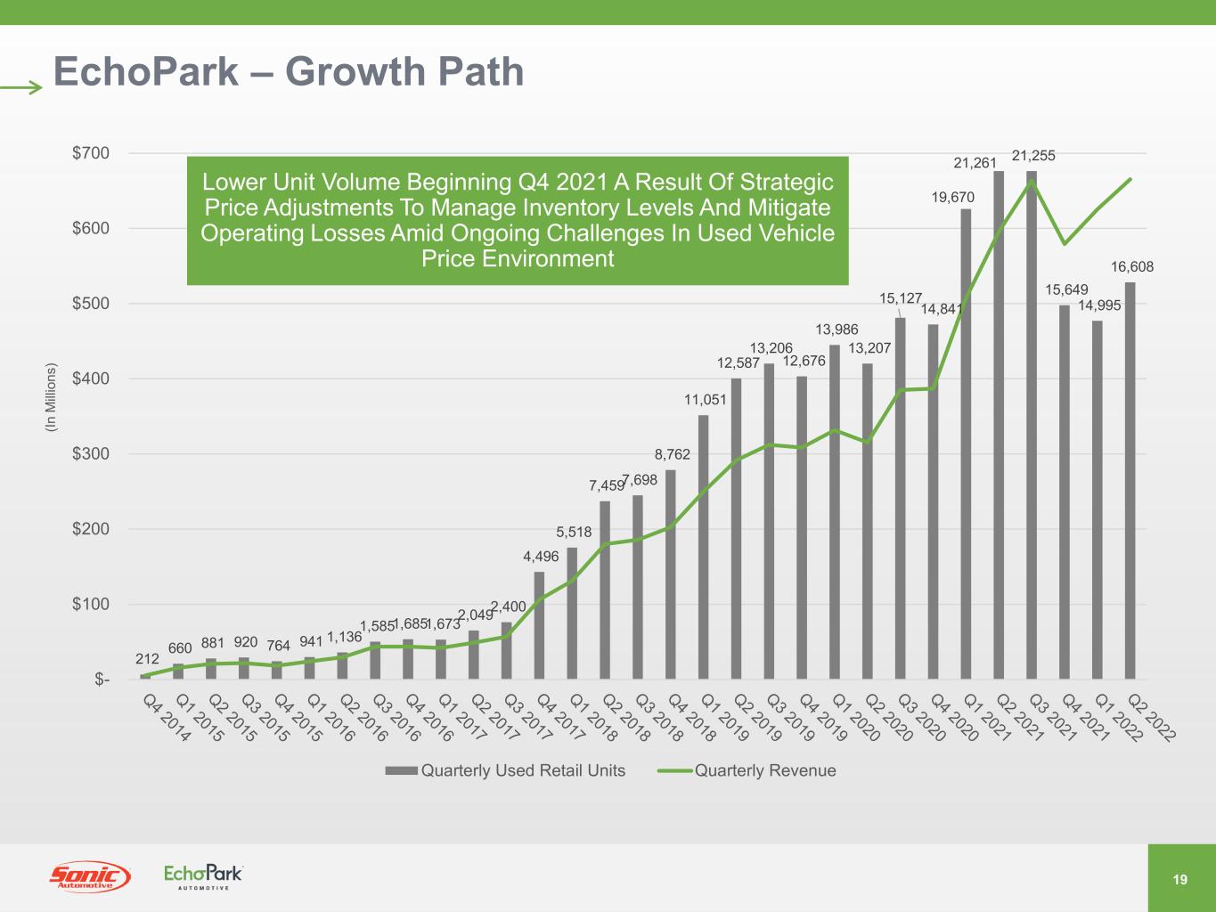 18 EchoPark – Initial Results In Houston Market $(1,500) $(1,300) $(1,100) $(900) $(700) $(500) $(300) ($ In T ho us an ds ) Used Retail Unit Volume Pre-Tax Profit (Loss) Beginning In Mid-April, Houston Market Piloted Expansion Of Inventory To Include 5+ Year Old Vehicles, Benefiting Non-Auction Sourcing Mix, Volume And Profitability 11% 46% % Non-Auction Sourced Inventory 13% Of Vehicle Sales 5+ Years Old 32% Of Vehicle Sales 5+ Years Old1% Of Vehicle Sales 5+ Years Old