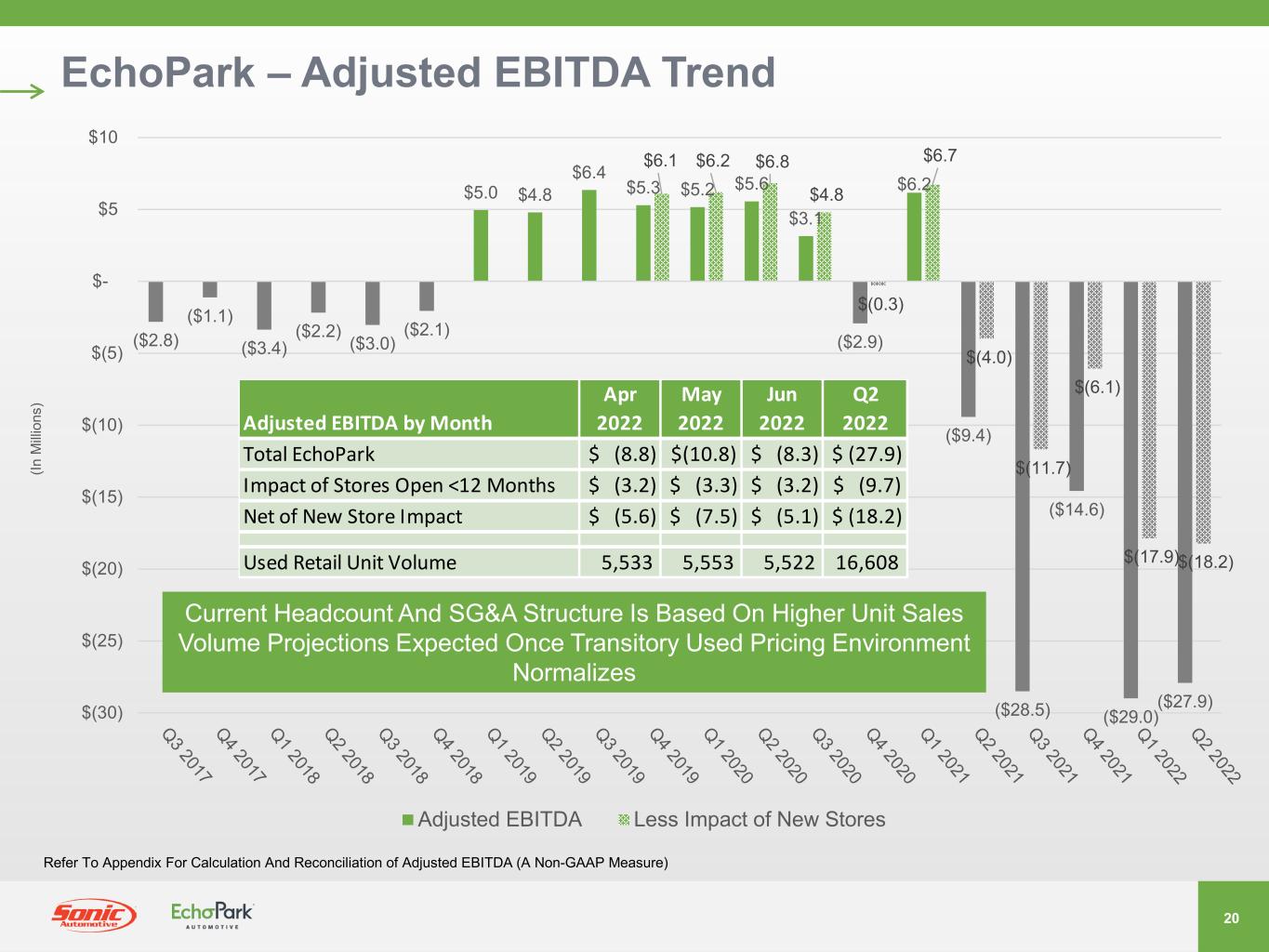 19 EchoPark – Growth Path 212 660 881 920 764 941 1,136 1,585 1,685 1,673 2,049 2,400 4,496 5,518 7,459 7,698 8,762 11,051 12,587 13,206 12,676 13,986 13,207 15,127 14,841 19,670 21,261 21,255 15,649 14,995 16,608 $- $100 $200 $300 $400 $500 $600 $700 (In M illi on s) Quarterly Used Retail Units Quarterly Revenue Lower Unit Volume Beginning Q4 2021 A Result Of Strategic Price Adjustments To Manage Inventory Levels And Mitigate Operating Losses Amid Ongoing Challenges In Used Vehicle Price Environment