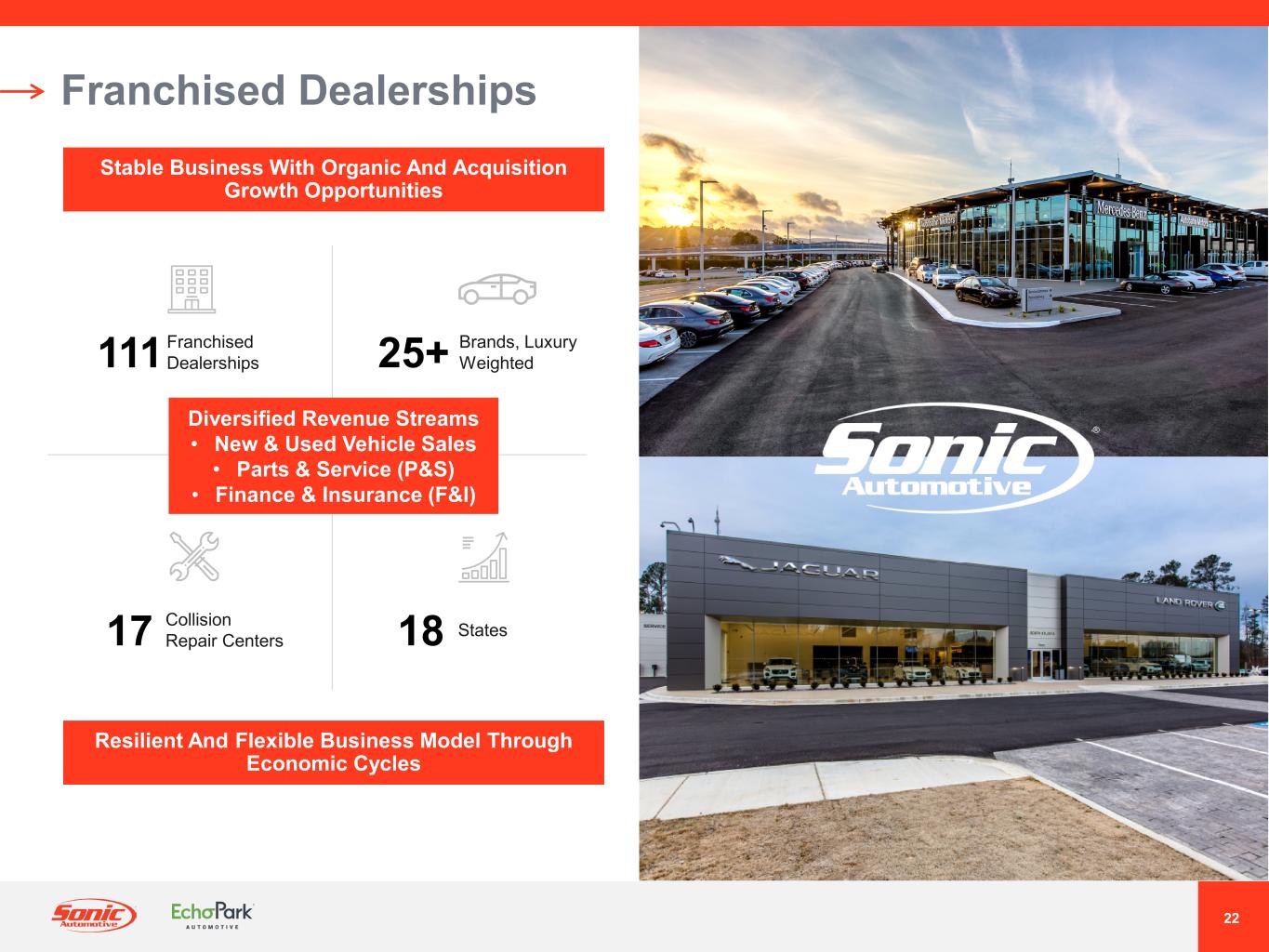 22 New & Used Vehicle Sales Parts & Service (P&S) Finance & Insurance (F&I) ® Franchised Dealerships Franchised Dealerships111 Brands, Luxury Weighted25+ Diversified Revenue Streams • New & Used Vehicle Sales • Parts Service (P S) • Finance & Insurance (F&I) Collision Repair Centers17 18 States Stable Business With Organic And Acquisition Growth Opportunities Resilient And Flexible Business Model Through Economic Cycles
