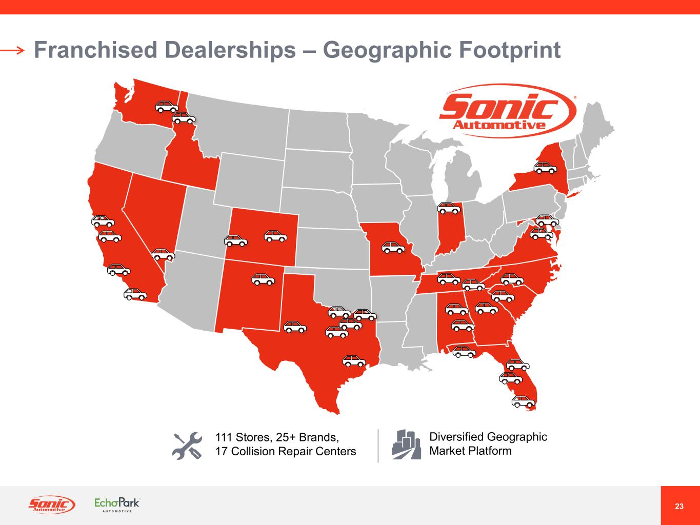 23 Franchised Dealerships – Geographic Footprint Diversified Geographic Market Platform 111 Stores, 25+ Brands, 17 Collision Repair Centers
