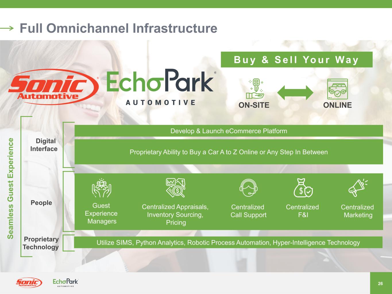 26 Full Omnichannel Infrastructure Guest Experience Managers Centralized Appraisals, Inventory Sourcing, Pricing Centralized Call Support Centralized F&I Digital Interface People Proprietary Technology Centralized Marketing Develop & Launch eCommerce Platform B u y & S e l l Yo u r Wa y Proprietary Ability to Buy a Car A to Z Online or Any Step In Between Utilize SIMS, Python Analytics, Robotic Process Automation, Hyper-Intelligence Technology ON-SITE ONLINE Se am le ss G ue st E xp er ie nc e