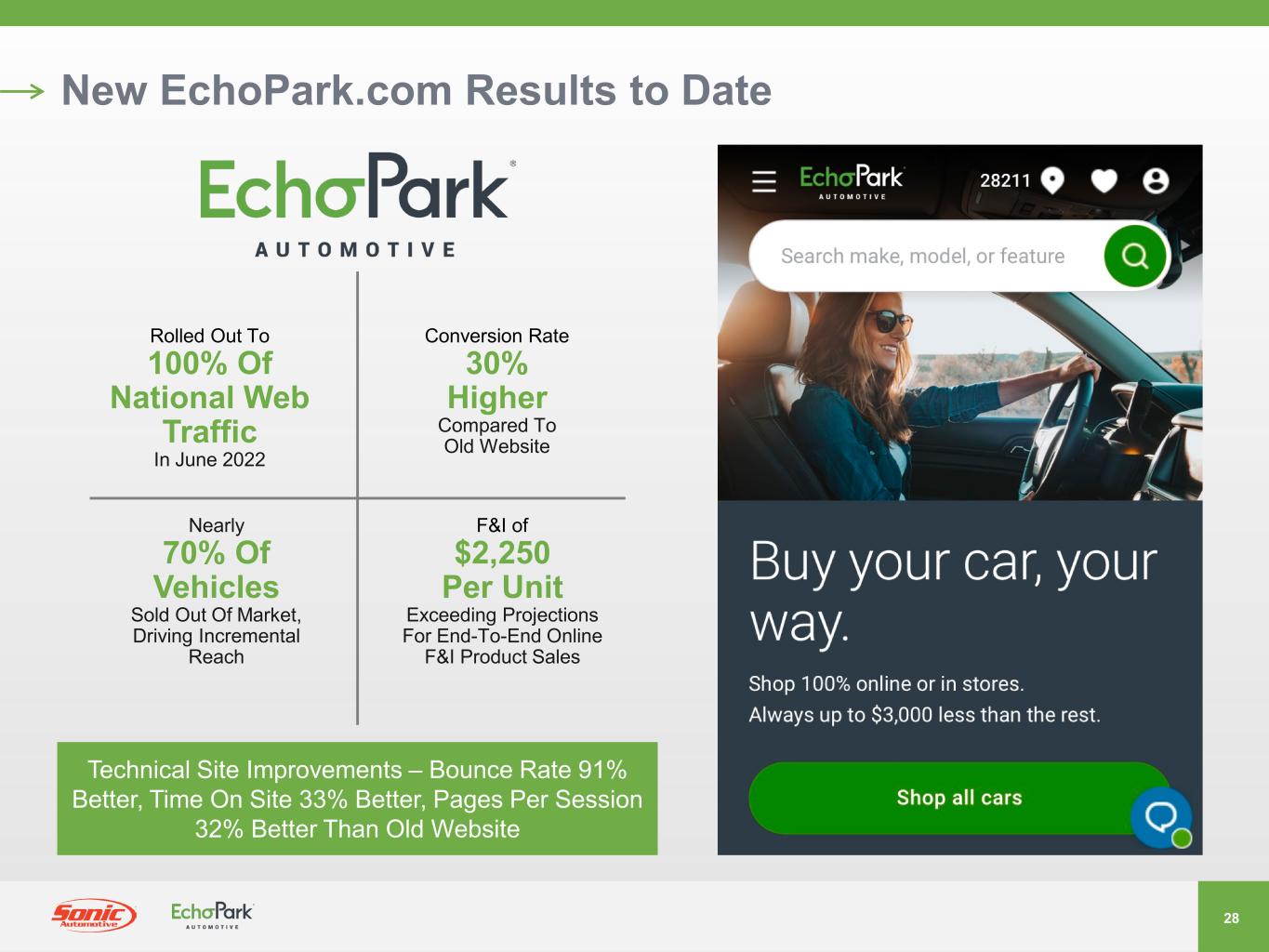 27 Buy & Sell Your Way • Complete A Traditional Vehicle Purchase Experience With A Modern, Technology- Enabled Approach • Can Be Completed In Under An Hour • Research Online, Utilize Chat, Text, Phone, Zoom To Reduce In-Person Process • Review And Select Insurance Products And Financing Options • Includes Online Trade-In Appraisal And Firm Purchase Offer • Complete A Full eCommerce Transaction In Minutes • Conveniently Test Drive And Finalize Purchase At Franchised Dealership, EchoPark Retail Hub Or EchoPark Delivery Center Buy & Sell Your Way Start Online, Finish On-Site Or Buy Completely Online Buy On-Site • Our Blend Of Brick And Mortar And eCommerce Strategies Allows Guests To Choose Their Preferred Buying Approach • A Flexible, Guest- Centric Experience With Options • Will Be Seamless To The Guest, Regardless Of Which Path They Choose Represents 19% Of Q2 2022 EchoPark Unit Sales Volume