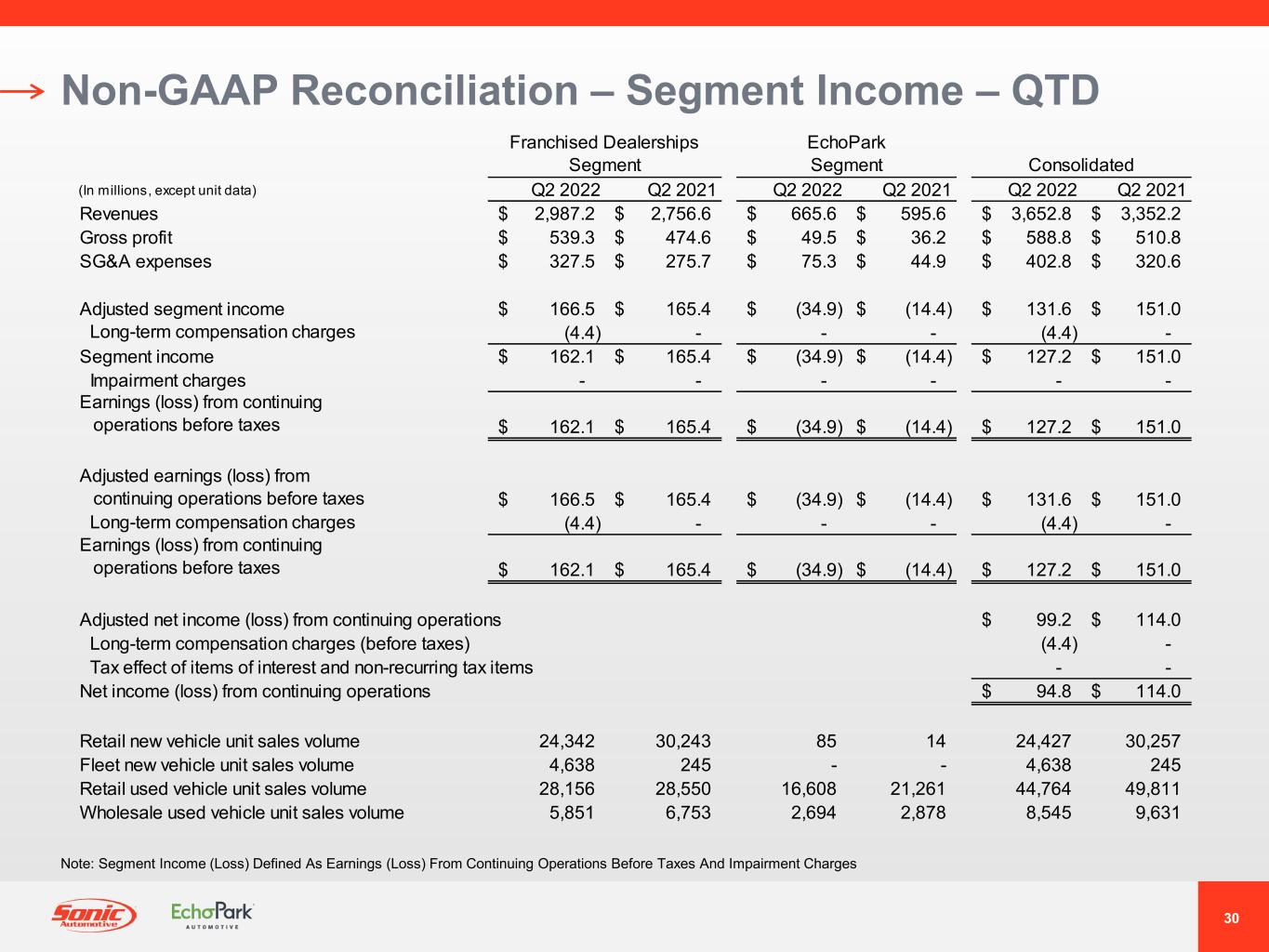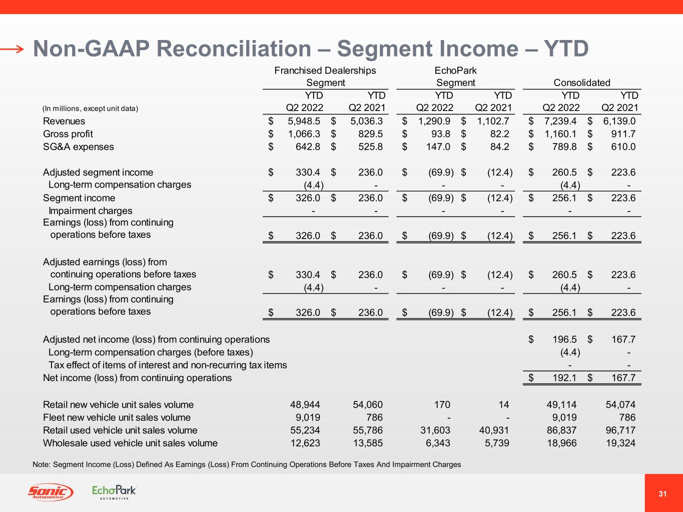 30 Non-GAAP Reconciliation – Segment Income – QTD Franchised Dealerships Segment EchoPark Segment Consolidated (In millions, except unit data) Q2 2022 Q2 2021 Q2 2022 Q2 2021 Q2 2022 Q2 2021 Revenues 2,987.2$ 2,756.6$ 665.6$ 595.6$ 3,652.8$ 3,352.2$ Gross profit 539.3$ 474.6$ 49.5$ 36.2$ 588.8$ 510.8$ SG&A expenses 327.5$ 275.7$ 75.3$ 44.9$ 402.8$ 320.6$ Adjusted segment income 166.5$ 165.4$ (34.9)$ (14.4)$ 131.6$ 151.0$ Long-term compensation charges (4.4) - - - (4.4) - Segment income 162.1$ 165.4$ (34.9)$ (14.4)$ 127.2$ 151.0$ Impairment charges - - - - - - Earnings (loss) from continuing operations before taxes 162.1$ 165.4$ (34.9)$ (14.4)$ 127.2$ 151.0$ Adjusted earnings (loss) from continuing operations before taxes 166.5$ 165.4$ (34.9)$ (14.4)$ 131.6$ 151.0$ Long-term compensation charges (4.4) - - - (4.4) - Earnings (loss) from continuing operations before taxes 162.1$ 165.4$ (34.9)$ (14.4)$ 127.2$ 151.0$ Adjusted net income (loss) from continuing operations 99.2$ 114.0$ Long-term compensation charges (before taxes) (4.4) - Tax effect of items of interest and non-recurring tax items - - Net income (loss) from continuing operations 94.8$ 114.0$ Retail new vehicle unit sales volume 24,342 30,243 85 14 24,427 30,257 Fleet new vehicle unit sales volume 4,638 245 - - 4,638 245 Retail used vehicle unit sales volume 28,156 28,550 16,608 21,261 44,764 49,811 Wholesale used vehicle unit sales volume 5,851 6,753 2,694 2,878 8,545 9,631 Note: Segment Income (Loss) Defined As Earnings (Loss) From Continuing Operations Before Taxes And Impairment Charges