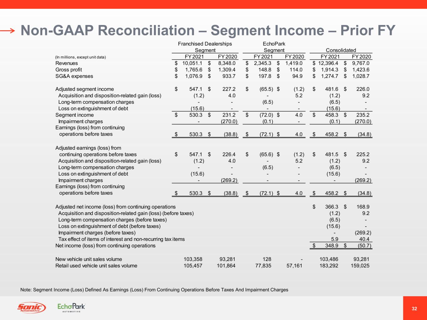31 Non-GAAP Reconciliation – Segment Income – YTD Franchised Dealerships Segment EchoPark Segment Consolidated (In millions, except unit data) YTD Q2 2022 YTD Q2 2021 YTD Q2 2022 YTD Q2 2021 YTD Q2 2022 YTD Q2 2021 Revenues 5,948.5$ 5,036.3$ 1,290.9$ 1,102.7$ 7,239.4$ 6,139.0$ Gross profit 1,066.3$ 829.5$ 93.8$ 82.2$ 1,160.1$ 911.7$ SG&A expenses 642.8$ 525.8$ 147.0$ 84.2$ 789.8$ 610.0$ Adjusted segment income 330.4$ 236.0$ (69.9)$ (12.4)$ 260.5$ 223.6$ Long-term compensation charges (4.4) - - - (4.4) - Segment income 326.0$ 236.0$ (69.9)$ (12.4)$ 256.1$ 223.6$ Impairment charges - - - - - - Earnings (loss) from continuing operations before taxes 326.0$ 236.0$ (69.9)$ (12.4)$ 256.1$ 223.6$ Adjusted earnings (loss) from continuing operations before taxes 330.4$ 236.0$ (69.9)$ (12.4)$ 260.5$ 223.6$ Long-term compensation charges (4.4) - - - (4.4) - Earnings (loss) from continuing operations before taxes 326.0$ 236.0$ (69.9)$ (12.4)$ 256.1$ 223.6$ Adjusted net income (loss) from continuing operations 196.5$ 167.7$ Long-term compensation charges (before taxes) (4.4) - Tax effect of items of interest and non-recurring tax items - - Net income (loss) from continuing operations 192.1$ 167.7$ Retail new vehicle unit sales volume 48,944 54,060 170 14 49,114 54,074 Fleet new vehicle unit sales volume 9,019 786 - - 9,019 786 Retail used vehicle unit sales volume 55,234 55,786 31,603 40,931 86,837 96,717 Wholesale used vehicle unit sales volume 12,623 13,585 6,343 5,739 18,966 19,324 Note: Segment Income (Loss) Defined As Earnings (Loss) From Continuing Operations Before Taxes And Impairment Charges