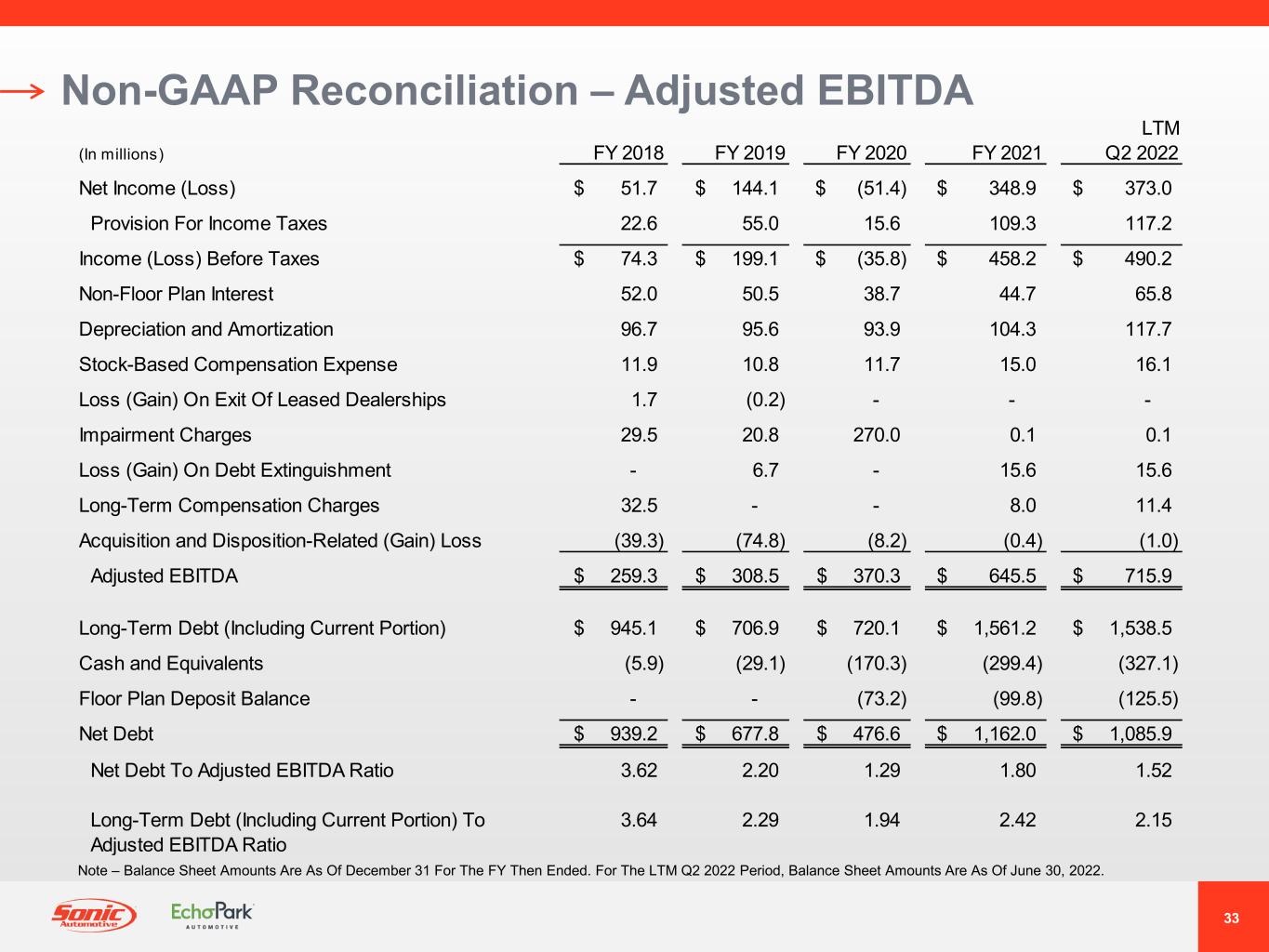 32 Non-GAAP Reconciliation – Segment Income – Prior FY Franchised Dealerships Segment EchoPark Segment Consolidated (In millions, except unit data) FY 2021 FY 2020 FY 2021 FY 2020 FY 2021 FY 2020 Revenues 10,051.1$ 8,348.0$ 2,345.3$ 1,419.0$ 12,396.4$ 9,767.0$ Gross profit 1,765.6$ 1,309.4$ 148.8$ 114.0$ 1,914.3$ 1,423.6$ SG&A expenses 1,076.9$ 933.7$ 197.8$ 94.9$ 1,274.7$ 1,028.7$ Adjusted segment income 547.1$ 227.2$ (65.5)$ (1.2)$ 481.6$ 226.0$ Acquisition and disposition-related gain (loss) (1.2) 4.0 - 5.2 (1.2) 9.2 Long-term compensation charges - - (6.5) - (6.5) - Loss on extinguishment of debt (15.6) - - - (15.6) - Segment income 530.3$ 231.2$ (72.0)$ 4.0$ 458.3$ 235.2$ Impairment charges - (270.0) (0.1) - (0.1) (270.0) Earnings (loss) from continuing operations before taxes 530.3$ (38.8)$ (72.1)$ 4.0$ 458.2$ (34.8)$ Adjusted earnings (loss) from continuing operations before taxes 547.1$ 226.4$ (65.6)$ (1.2)$ 481.5$ 225.2$ Acquisition and disposition-related gain (loss) (1.2) 4.0 - 5.2 (1.2) 9.2 Long-term compensation charges - - (6.5) - (6.5) - Loss on extinguishment of debt (15.6) - - - (15.6) - Impairment charges - (269.2) - - - (269.2) Earnings (loss) from continuing operations before taxes 530.3$ (38.8)$ (72.1)$ 4.0$ 458.2$ (34.8)$ Adjusted net income (loss) from continuing operations 366.3$ 168.9$ Acquisition and disposition-related gain (loss) (before taxes) (1.2) 9.2 Long-term compensation charges (before taxes) (6.5) - Loss on extinguishment of debt (before taxes) (15.6) - Impairment charges (before taxes) - (269.2) Tax effect of items of interest and non-recurring tax items 5.9 40.4 Net income (loss) from continuing operations 348.9$ (50.7)$ New vehicle unit sales volume 103,358 93,281 128 - 103,486 93,281 Retail used vehicle unit sales volume 105,457 101,864 77,835 57,161 183,292 159,025 Note: Segment Income (Loss) Defined As Earnings (Loss) From Continuing Operations Before Taxes And Impairment Charges