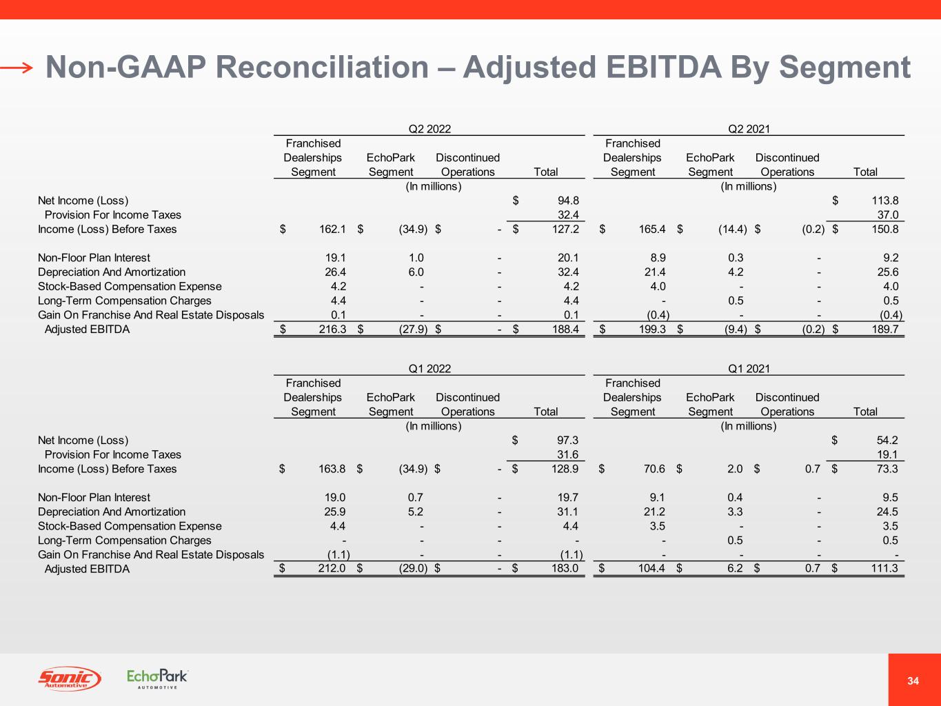 40 Franchised Dealerships Segment EchoPark Segment Discontinued Operations Total Franchised Dealerships Segment EchoPark Segment Discontinued Operations Total (In millions) (In millions) Net Income (Loss) $ 42.2 $ (2.2) Provision For Income Taxes 19.0 (1.9) Income (Loss) Before Taxes $ 61.2 $ 0.2 $ (0.2) $ 61.2 $ 10.8 $ (14.7) $ (0.2) $ (4.1) Non-Floor Plan Interest 11.8 0.5 - 12.3 12.4 0.3 0.1 12.8 Depreciation And Amortization 20.8 2.4 - 23.2 22.8 1.7 - 24.5 Stock-Based Compensation Expense 2.8 - - 2.8 3.0 - - 3.0 Loss (Gain) On Exit Of Leased Dealerships (0.2) - - (0.2) 5.0 - 0.1 5.1 Impairment Charges - 1.9 - 1.9 3.6 0.1 - 3.7 Long-Term Compensation Charges - - - - - 9.2 - 9.2 Gain On Franchise Disposals (46.7) - - (46.7) (1.2) - - (1.2) Adjusted EBITDA $ 49.7 $ 5.0 $ (0.2) $ 54.5 $ 56.4 $ (3.4) $ - $ 53.0 Q1 2019 Q1 2018 Franchised Dealerships Segment EchoPark Segment Discontinued Operations Total Franchised Dealerships Segment EchoPark Segment Discontinued Operations Total (In millions) (In millions) Net Income (Loss) $ 26.6 $ 16.9 Provision For Income Taxes $ 10.0 8.1 Income (Loss) Before Taxes $ 35.1 $ 1.7 $ (0.2) $ 36.6 $ 53.2 $ (27.8) $ (0.4) $ 25.0 Non-Floor Plan Interest $ 12.6 $ 0.4 - 13.0 12.3 0.4 0.1 12.8 Depreciation And Amortization $ 21.7 $ 2.7 - 24.4 22.8 1.9 - 24.7 Stock-Based Compensation Expense $ 2.6 - - 2.6 3.0 - - 3.0 Loss (Gain) On Exit Of Leased Dealerships - - - - (2.6) - 0.1 (2.5) Impairment Charges - - - - 10.3 - - 10.3 Long-Term Compensation Charges - - - - - 23.3 - 23.3 Gain On Franchise Disposals $ 0.4 - - 0.4 (38.0) - - (38.0) Adjusted EBITDA $ 72.4 $ 4.8 $ (0.2) $ 77.0 $ 61.0 $ (2.2) $ (0.2) $ 58.6 Q2 2019 Q2 2018 Non-GAAP Reconciliation – Adjusted EBITDA By Segment