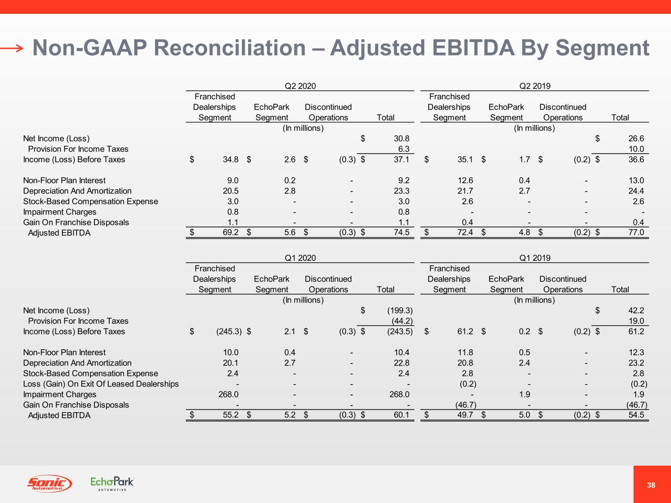 38 Franchised Dealerships Segment EchoPark Segment Discontinued Operations Total Franchised Dealerships Segment EchoPark Segment Discontinued Operations Total (In millions) (In millions) Net Income (Loss) $ 30.8 $ 26.6 Provision For Income Taxes 6.3 10.0 Income (Loss) Before Taxes $ 34.8 $ 2.6 $ (0.3) $ 37.1 $ 35.1 $ 1.7 $ (0.2) $ 36.6 Non-Floor Plan Interest 9.0 0.2 - 9.2 12.6 0.4 - 13.0 Depreciation And Amortization 20.5 2.8 - 23.3 21.7 2.7 - 24.4 Stock-Based Compensation Expense 3.0 - - 3.0 2.6 - - 2.6 Impairment Charges 0.8 - - 0.8 - - - - Gain On Franchise Disposals 1.1 - - 1.1 0.4 - - 0.4 Adjusted EBITDA $ 69.2 $ 5.6 $ (0.3) $ 74.5 $ 72.4 $ 4.8 $ (0.2) $ 77.0 Q2 2020 Q2 2019 Franchised Dealerships Segment EchoPark Segment Discontinued Operations Total Franchised Dealerships Segment EchoPark Segment Discontinued Operations Total (In millions) (In millions) Net Income (Loss) $ (199.3) $ 42.2 Provision For Income Taxes (44.2) 19.0 Income (Loss) Before Taxes $ (245.3) $ 2.1 $ (0.3) $ (243.5) $ 61.2 $ 0.2 $ (0.2) $ 61.2 Non-Floor Plan Interest 10.0 0.4 - 10.4 11.8 0.5 - 12.3 Depreciation And Amortization 20.1 2.7 - 22.8 20.8 2.4 - 23.2 Stock-Based Compensation Expense 2.4 - - 2.4 2.8 - - 2.8 Loss (Gain) On Exit Of Leased Dealerships - - - - (0.2) - - (0.2) Impairment Charges 268.0 - - 268.0 - 1.9 - 1.9 Gain On Franchise Disposals - - - - (46.7) - - (46.7) Adjusted EBITDA $ 55.2 $ 5.2 $ (0.3) $ 60.1 $ 49.7 $ 5.0 $ (0.2) $ 54.5 Q1 2020 Q1 2019 Non-GAAP Reconciliation – Adjusted EBITDA By Segment
