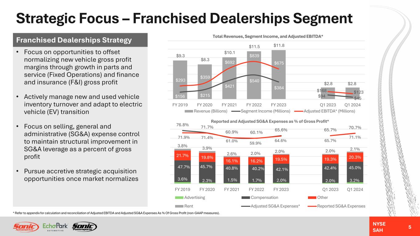 NYSE SAH Diversified Portfolio And Business Lines 4 Geographic Distribution TX 27% CA 23% CO 9% TN 7% FL 5% AL 5% NC 5% GA 4% ID 3% VA 2% MD 2% NV 2% All Others 6% Total Revenues By State Note: Percentages are percent of total for year ended December 31, 2023. 5% 30% 12% 39% 38% 7% 45% 24% Revenue Gross Profit New Vehicle Used Vehicle (Including Wholesale) Parts, Service & Collision Repair ("Fixed Operations") Finance & Insurance ("F&I") Category % of Revenue Franchised Brand % of Revenue BMW 21% Mercedes 11% Audi 6% Lexus 4% Porsche 3% Land Rover 3% Cadillac 2% Other Luxury (1) 3% Honda 9% Toyota 7% Other Import (2) 3% EchoPark 17% Non-Franchised 17% Chevrolet GMC Buick 4% Ford 4% Chrysler Dodge Jeep RAM 3% Powersports <1% Powersports (3) <1% Luxury 53% 19%Import Domestic 11% (1) Includes Alfa Romeo, Infiniti, Jaguar, Maserati, MINI and Volvo (2) Includes Hyundai, Nissan, Mazda, Subaru and Volkswagen (3) Includes Harley-Davidson, Kawasaki, BRP, Polaris, Honda, Suzuki, BMW Motorrad, Yamaha, Ducati, and Indian Motorcycle Business Line MixBrand Distribution