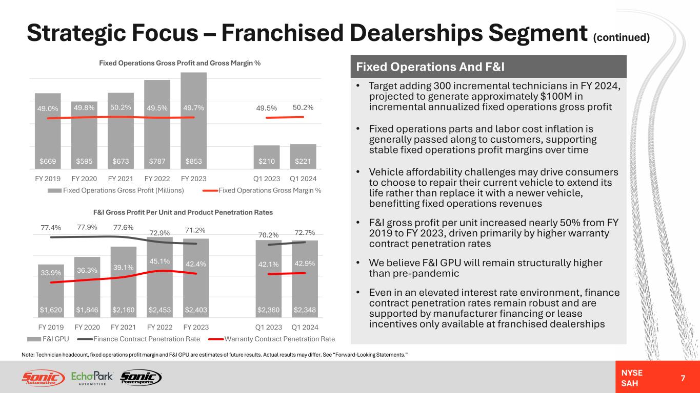NYSE SAH Strategic Focus – Franchised Dealerships Segment (continued) 6 111.5 91.9 99.8 99.4 107.3 24.5 25.3 $42.9 $45.9 $49.9 $56.1 $57.9 $57.9 $56.9 $2,078 $2,536 $4,595 $6,591 $4,836 $5,463 $3,722 FY 2019 FY 2020 FY 2021 FY 2022 FY 2023 Q1 2023 Q1 2024 Retail New Vehicle Unit Sales Volume, Revenue, and Gross Profit Per Unit Unit Sales Volume (Thousands) Revenue Per Unit (Thousands) GPU 112.6 101.9 105.5 108.5 100.2 25.1 25.7 $22.1 $23.0 $27.5 $31.3 $30.4 $30.6 $28.4 $1,310 $1,207 $1,784 $1,607 $1,626 $1,626 $1,592 FY 2019 FY 2020 FY 2021 FY 2022 FY 2023 Q1 2023 Q1 2024 Retail Used Vehicle Unit Sales Volume, Revenue, and Gross Profit Per Unit Unit Sales Volume (Thousands) Revenue Per Unit (Thousands) GPU Retail New And Used Vehicles • While new vehicle GPUs continue to decline, we believe the "new normal" will be significantly higher than pre-pandemic levels • We believe used vehicle GPU may decline over time if we are able to drive higher retail used vehicle unit sales volume by supplementing our inventory levels from wholesale auction sources as off-rental inventory supply returns to normal • Strategic focus to return to selling at least 100 retail used vehicles per store per month, on average (represents approximately 25% improvement in retail used vehicle volume throughput per store) • As new and used vehicle sales volumes recover from pandemic-induced lows, F&I gross profit and fixed operations gross profit should benefit, partially offsetting vehicle gross margin normalization Note: New and used vehicle GPU, sales volume, and F&I and fixed operations gross profit expectations and projections are estimates of future results. Actual results may differ. See “Forward-Looking Statements.”