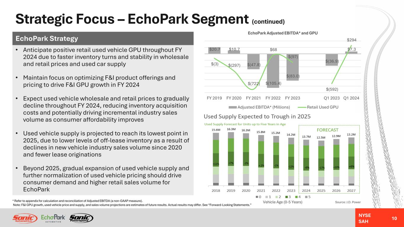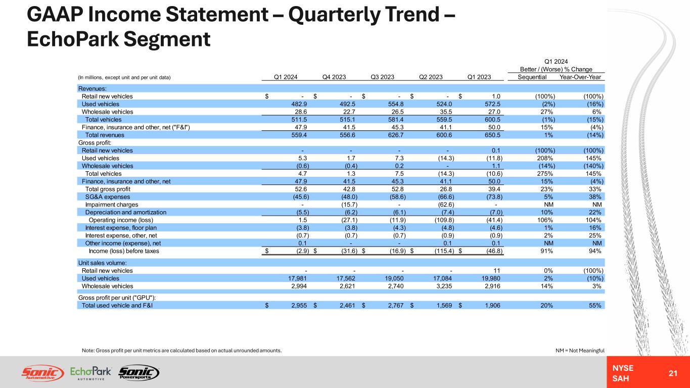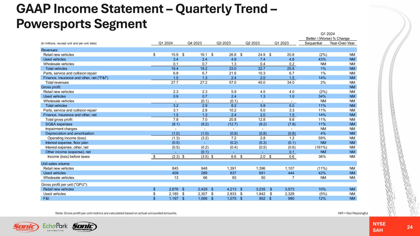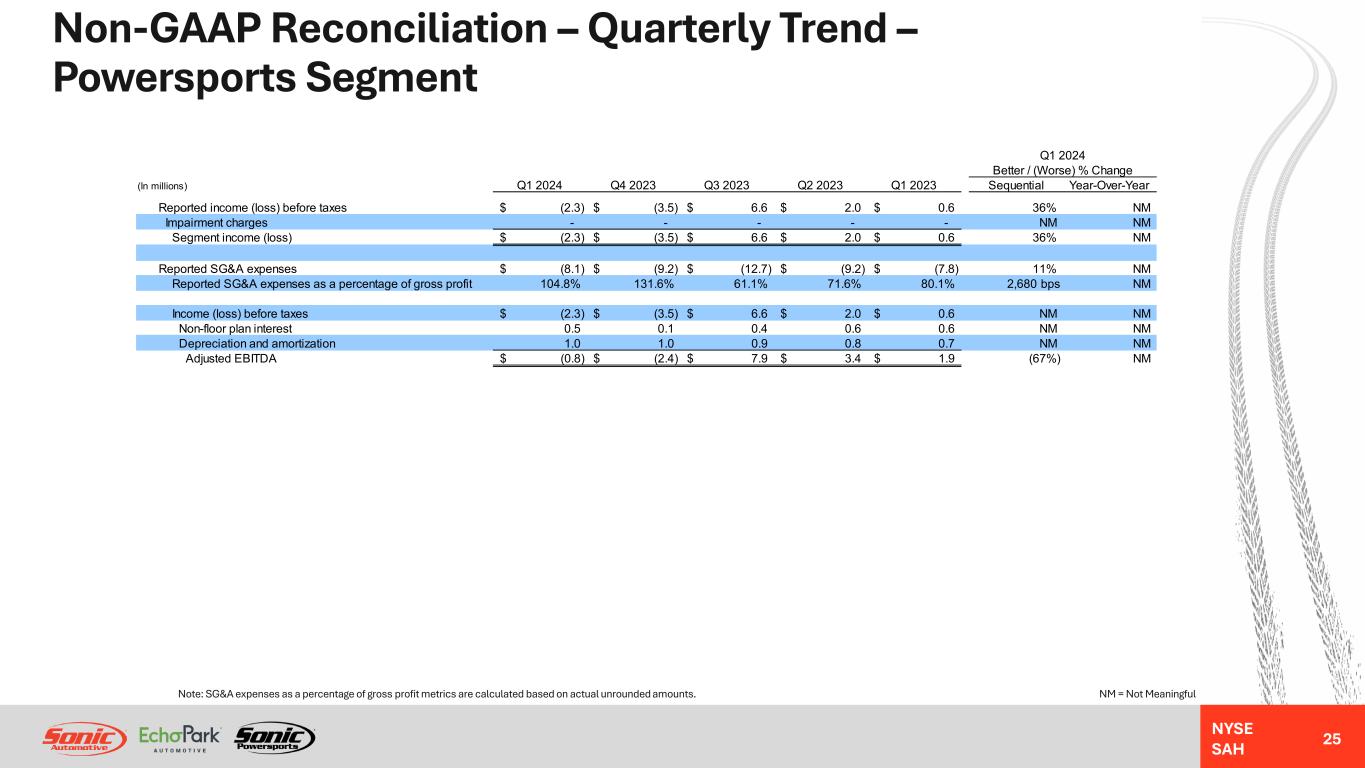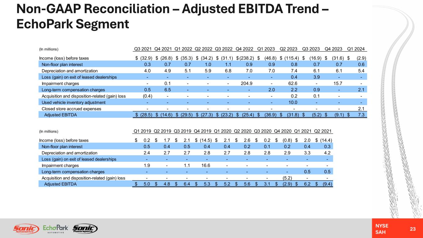 NYSE SAH Non-GAAP Reconciliation – Adjusted EBITDA Trend – EchoPark Segment 23 (In millions) Q3 2021 Q4 2021 Q1 2022 Q2 2022 Q3 2022 Q4 2022 Q1 2023 Q2 2023 Q3 2023 Q4 2023 Q1 2024 Income (loss) before taxes (32.9)$ (26.8)$ (35.3)$ (34.2)$ (31.1)$ (238.2)$ (46.8)$ (115.4)$ (16.9)$ (31.6)$ (2.9)$ Non-floor plan interest 0.3 0.7 0.7 1.0 1.1 0.9 0.9 0.8 0.7 0.7 0.6 Depreciation and amortization 4.0 4.9 5.1 5.9 6.8 7.0 7.0 7.4 6.1 6.1 5.4 Loss (gain) on exit of leased dealerships - - - - - - - 0.4 3.9 - - Impairment charges - 0.1 - - - 204.9 - 62.6 - 15.7 - Long-term compensation charges 0.5 6.5 - - - - 2.0 2.2 0.9 - 2.1 Acquisition and disposition-related (gain) loss (0.4) - - - - - - 0.2 0.1 - - Used vehicle inventory adjustment - - - - - - - 10.0 - - - Closed store accrued expenses - - - - - - - - - - 2.1 Adjusted EBITDA (28.5)$ (14.6)$ (29.5)$ (27.3)$ (23.2)$ (25.4)$ (36.9)$ (31.8)$ (5.2)$ (9.1)$ 7.3$ (In millions) Q1 2019 Q2 2019 Q3 2019 Q4 2019 Q1 2020 Q2 2020 Q3 2020 Q4 2020 Q1 2021 Q2 2021 Income (loss) before taxes 0.2$ 1.7$ 2.1$ (14.5)$ 2.1$ 2.6$ 0.2$ (0.8)$ 2.0$ (14.4)$ Non-floor plan interest 0.5 0.4 0.5 0.4 0.4 0.2 0.1 0.2 0.4 0.3 Depreciation and amortization 2.4 2.7 2.7 2.8 2.7 2.8 2.8 2.9 3.3 4.2 Loss (gain) on exit of leased dealerships - - - - - - - - - - Impairment charges 1.9 - 1.1 16.6 - - - - - - Long-term compensation charges - - - - - - - - 0.5 0.5 Acquisition and disposition-related (gain) loss - - - - - - - (5.2) - - Adjusted EBITDA 5.0$ 4.8$ 6.4$ 5.3$ 5.2$ 5.6$ 3.1$ (2.9)$ 6.2$ (9.4)$