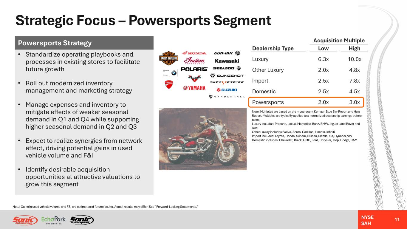 NYSE SAH Strategic Focus – EchoPark Segment (continued) 10 • Anticipate positive retail used vehicle GPU throughout FY 2024 due to faster inventory turns and stability in wholesale and retail prices and used car supply • Maintain focus on optimizing F&I product offerings and pricing to drive F&I GPU growth in FY 2024 • Expect used vehicle wholesale and retail prices to gradually decline throughout FY 2024, reducing inventory acquisition costs and potentially driving incremental industry sales volume as consumer affordability improves • Used vehicle supply is projected to reach its lowest point in 2025, due to lower levels of off-lease inventory as a result of declines in new vehicle industry sales volume since 2020 and fewer lease originations • Beyond 2025, gradual expansion of used vehicle supply and further normalization of used vehicle pricing should drive consumer demand and higher retail sales volume for EchoPark EchoPark Strategy $20.7 $10.7 $(47.8) $(105.4) $(83.0) $(36.9) $7.3 $(3) $(297) $(722) $68 $(97) $(592) $294 FY 2019 FY 2020 FY 2021 FY 2022 FY 2023 Q1 2023 Q1 2024 EchoPark Adjusted EBITDA* and GPU Adjusted EBITDA* (Millions) Retail Used GPU Source: J.D. PowerVehicle Age (0-5 Years)* Refer to appendix for calculation and reconciliation of Adjusted EBITDA (a non-GAAP measure). Note: F&I GPU growth, used vehicle price and supply, and sales volume projections are estimates of future results. Actual results may differ. See “Forward-Looking Statements.”