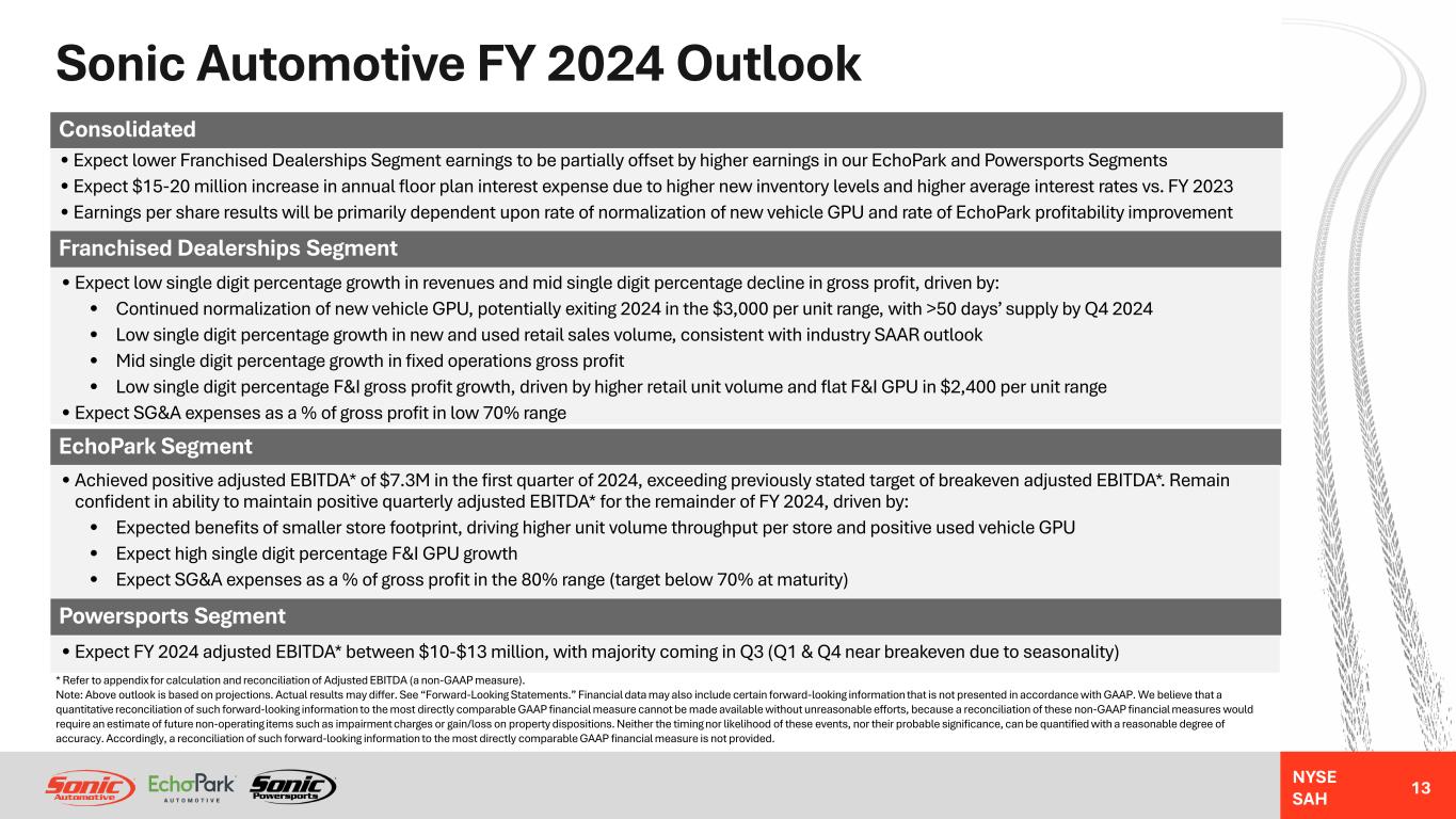 NYSE SAH Strategic Focus – Consolidated Company 12 • Expect to maintain strong balance sheet and free cash flows • Balanced capital allocation strategy prioritizes highest return opportunity • History of returning capital to shareholders via dividend and share repurchases • Quarterly dividend per share has grown 200% since 2019, current yield over 2.25% • Reduced outstanding shares by 21% since 2019 ($260 million remaining authorization, or ~15% of market cap) • Net debt to adjusted EBITDA ratio* of 2.18 for the 12 months ended Q1 2024 is within our target leverage range Consolidated Company Strategy $29 $244 $399 $501 $374 $335 $280 $526 $703 $794 $846 $847 $- $200 $400 $600 $800 $1,000 12/31/2019 12/31/2020 12/31/2021 12/31/2022 12/31/2023 3/31/2024 $ In M ill io ns Strong Balance Sheet and Liquidity Cash and Floor Plan Deposit Balance Total Liquidity * Refer to appendix for calculation and reconciliation of Net Debt to Adjusted EBITDA Ratio (a non-GAAP measure). Note: Dividend yield and market cap are based on stock price as of April 24, 2024. Note: Balance sheet and free cash flow projections are estimates of future results. Actual results may differ. See “Forward-Looking Statements.” $20 $1,019 $102 $75 $126 $127 $298 $227 $204 $72 $93 $262 $178 $16 $17 $18 $35 $40 2019 2020 2021 2022 2023 $ In M ill io ns Capital Allocation Trend Acquisitions Cap Ex Share Repurchases Dividends Note: Cap Ex represents total purchases of land, property and equipment from consolidated statements of cash flows included in Sonic’s Annual Report on Form 10-K for the applicable fiscal year.