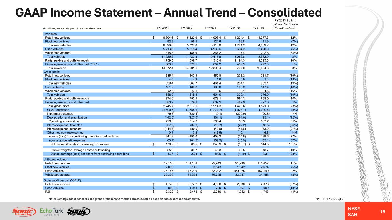 NYSE SAH GAAP Income Statement – Annual Trend – Consolidated 15 NM = Not MeaningfulNote: Earnings (loss) per share and gross profit per unit metrics are calculated based on actual unrounded amounts. FY 2023 Better / (Worse) % Change (In millions, except unit, per unit, and per share data) FY 2023 FY 2022 FY 2021 FY 2020 FY 2019 Year-Over-Year Revenues: Retail new vehicles 6,304.6$ 5,622.6$ 4,993.4$ 4,224.4$ 4,777.3$ 12% Fleet new vehicles 92.2 99.4 124.6 56.8 111.9 (7%) Total new vehicles 6,396.8 5,722.0 5,118.0 4,281.2 4,889.2 12% Used vehicles 5,213.6 5,515.4 4,933.6 3,604.2 3,490.0 (5%) Wholesale vehicles 318.8 484.9 367.2 197.4 202.8 (34%) Total vehicles 11,929.2 11,722.3 10,418.8 8,082.8 8,582.0 2% Parts, service and collision repair 1,759.5 1,599.7 1,340.4 1,194.3 1,395.3 10% Finance, insurance and other, net ("F&I") 683.7 679.1 637.2 489.9 477.0 1% Total revenues 14,372.4 14,001.1 12,396.4 9,767.0 10,454.3 3% Gross profit: Retail new vehicles 535.4 662.8 459.8 233.2 231.7 (19%) Fleet new vehicles 4.0 4.9 1.6 0.9 1.4 (18%) Total new vehicles 539.4 667.7 461.4 234.1 233.1 (19%) Used vehicles 151.2 180.8 133.0 105.2 147.4 (16%) Wholesale vehicles (2.6) (3.1) 9.6 0.1 (4.5) 16% Total vehicles 688.0 845.4 604.0 339.4 376.0 (19%) Parts, service and collision repair 874.0 792.5 673.1 594.3 668.0 10% Finance, insurance and other, net 683.7 679.1 637.2 489.9 477.0 1% Total gross profit 2,245.7 2,317.0 1,914.3 1,423.6 1,521.0 (3%) SG&A expenses (1,600.5) (1,555.1) (1,274.7) (1,028.7) (1,099.4) (3%) Impairment charges (79.3) (320.4) (0.1) (270.0) (20.8) NM Depreciation and amortization (142.3) (127.5) (101.1) (91.0) (93.1) (12%) Operating income (loss) 423.6 314.0 538.4 33.9 307.7 35% Interest expense, floor plan (67.2) (34.3) (16.7) (27.2) (48.5) (96%) Interest expense, other, net (114.6) (89.9) (48.0) (41.6) (53.0) (27%) Other income (expense), net 0.1 0.2 (15.5) 0.1 (6.6) NM Income (loss) from continuing operations before taxes 241.9 190.0 458.2 (34.8) 199.6 27% Income tax benefit (expense) (63.7) (101.5) (109.3) (15.9) (55.1) 37% Net income (loss) from continuing operations 178.2$ 88.5$ 348.9$ (50.7)$ 144.5$ 101% Diluted weighted-average shares outstanding 35.9 39.7 43.3 42.5 43.7 10% Diluted earnings (loss) per share from continuing operations 4.97$ 2.23$ 8.06$ (1.19)$ 3.31$ 123% Unit sales volume: Retail new vehicles 112,110 101,168 99,943 91,939 111,457 11% Fleet new vehicles 2,000 2,115 3,543 1,342 2,674 (5%) Used vehicles 176,147 173,209 183,292 159,025 162,149 2% Wholesale vehicles 32,330 35,323 36,795 32,057 34,153 (8%) Gross profit per unit ("GPU"): Retail new vehicles 4,776$ 6,552$ 4,600$ 2,536$ 2,078$ (27%) Used vehicles 859$ 1,043$ 720$ 667$ 909$ (18%) F&I 2,372$ 2,475$ 2,250$ 1,952$ 1,743$ (4%)