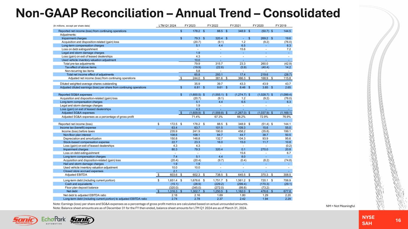 NYSE SAH Non-GAAP Reconciliation – Annual Trend – Consolidated 16 NM = Not MeaningfulNote: Earnings (loss) per share and SG&A expenses as a percentage of gross profit metrics are calculated based on actual unrounded amounts. Note: Balance sheet amounts are as of December 31 for the FY then ended, balance sheet amounts for LTM Q1 2024 are as of March 31, 2024. (In millions, except per share data) LTM Q1 2024 FY 2023 FY 2022 FY 2021 FY 2020 FY 2019 Reported net income (loss) from continuing operations 178.2$ 88.5$ 348.9$ (50.7)$ 144.5$ Adjustments: Impairment charges 79.3$ 320.4$ -$ 269.2$ 19.6$ Acquisition and disposition-related (gain) loss (20.7) (9.1) 1.2 (9.2) (76.0) Long-term compensation charges 5.1 4.4 6.5 - 6.3 Loss on debt extinguishment - - 15.6 - 7.2 Legal and storm damage charges 1.9 - - - - Loss (gain) on exit of leased dealerships 4.3 - - - - Used vehicle inventory valuation adjustment 10.0 - - - - Total pre-tax adjustments 79.9 315.7 23.3 260.0 (42.9) Tax effect of above items (19.9) (22.6) (5.9) (40.4) 14.2 Non-recurring tax items 5.8 - - - - Total net income effect of adjustments 65.8 293.1 17.4 219.6 (28.7) Adjusted net income (loss) from continuing operations 244.0$ 381.6$ 366.3$ 168.9$ 115.8$ Diluted weighted-average shares outstanding 35.9 39.7 43.3 43.9 43.7 Adjusted diluted earnings (loss) per share from continuing operations 6.81$ 9.61$ 8.46$ 3.85$ 2.65$ Reported SG&A expenses (1,600.5)$ (1,555.1)$ (1,274.7)$ (1,028.7)$ (1,099.4)$ Acquisition and disposition-related (gain) loss (20.7) (9.1) 1.2 (9.2) (76.0) Long-term compensation charges 5.1 4.4 6.5 - 6.3 Legal and storm damage charges 1.9 - - - - Loss (gain) on exit of leased dealerships 4.3 - - - - Adjusted SG&A expenses (1,609.9)$ (1,559.8)$ (1,267.0)$ (1,037.9)$ (1,169.1)$ Adjusted SG&A expenses as a percentage of gross profit 71.4% 67.3% 66.2% 72.9% 76.9% Reported net income (loss) 172.5$ 178.2$ 88.5$ 348.9$ (51.4)$ 144.1$ Income tax (benefit) expense 63.4 63.7 101.5 109.3 15.6 55.0 Income (loss) before taxes 235.9 241.9 190.0 458.2 (35.8) 199.1 Non-floor plan interest 108.6 108.1 84.7 44.7 38.7 50.5 Depreciation and amortization 150.8 148.8 132.7 104.3 93.9 95.6 Stock-based compensation expense 22.7 23.3 16.0 15.0 11.7 10.8 Loss (gain) on exit of leased dealerships 4.3 4.3 - - - (0.2) Impairment charges 80.3 79.3 320.4 0.1 270.0 20.8 Loss on debt extinguishment - - - 15.6 - 6.7 Long-term compensation charges 7.4 5.1 4.4 8.0 - - Acquisition and disposition-related (gain) loss (20.4) (20.4) (9.7) (0.4) (8.2) (74.8) Hail and storm damage charges 1.9 1.9 - - - - Used vehicle inventory valuation adjustment 10.0 10.0 - - - - Closed store accrued expenses 2.1 - - - - - Adjusted EBITDA 603.6$ 602.3$ 738.5$ 645.5$ 370.3$ 308.5$ Long-term debt (including current portion) 1,651.4$ 1,676.6$ 1,751.7$ 1,561.2$ 720.1$ 706.9$ Cash and equivalents (15.1) (28.9) (229.2) (299.4) (170.3) (29.1) Floor plan deposit balance (320.0) (345.0) (272.0) (99.8) (73.2) - Net debt 1,316.3$ 1,302.7$ 1,250.5$ 1,162.0$ 476.6$ 677.8$ Net debt to adjusted EBITDA ratio 2.18 2.16 1.69 1.80 1.29 2.20 Long-term debt (including current portion) to adjusted EBITDA ratio 2.74 2.78 2.37 2.42 1.94 2.29