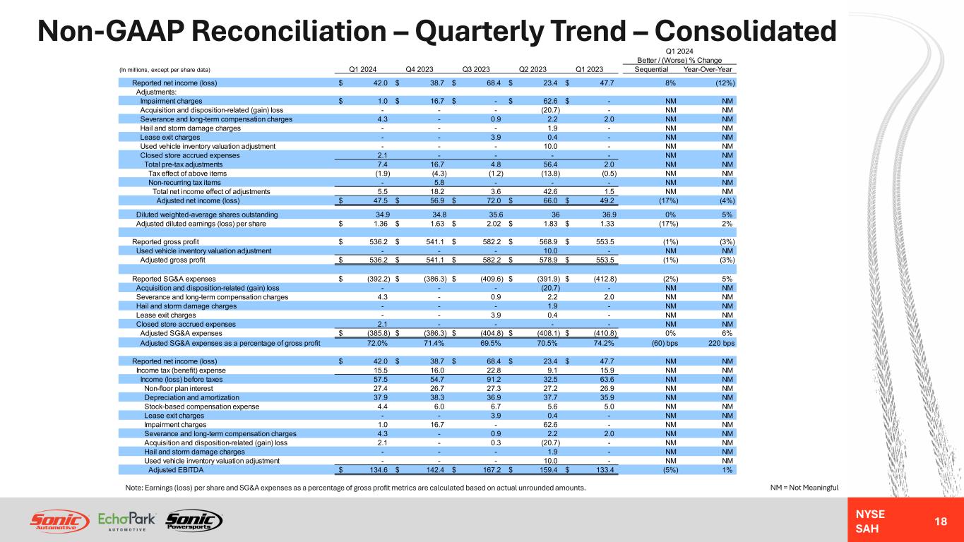NYSE SAH GAAP Income Statement – Quarterly Trend – Consolidated 17 NM = Not MeaningfulNote: Earnings (loss) per share and gross profit per unit metrics are calculated based on actual unrounded amounts. Q1 2024 Better / (Worse) % Change (In millions, except unit, per unit, and per share data) Q1 2024 Q4 2023 Q3 2023 Q2 2023 Q1 2023 Sequential Year-Over-Year Revenues: Retail new vehicles 1,455.8$ 1,680.2$ 1,573.5$ 1,608.2$ 1,442.8$ (13%) 1% Fleet new vehicles 19.6 21.8 23.2 28.3 18.8 (10%) 4% Total new vehicles 1,475.4 1,702.0 1,596.7 1,636.5 1,461.6 (13%) 1% Used vehicles 1,215.6 1,222.4 1,340.4 1,305.9 1,344.9 (1%) (10%) Wholesale vehicles 77.3 62.6 79.3 91.5 85.6 24% (10%) Total vehicles 2,768.3 2,987.0 3,016.4 3,033.9 2,892.1 (7%) (4%) Parts, service and collision repair 446.7 431.9 453.4 443.7 430.5 3% 4% Finance, insurance and other, net ("F&I") 169.0 166.0 173.7 175.3 168.6 2% 0% Total revenues 3,384.0 3,584.9 3,643.5 3,652.9 3,491.2 (6%) (3%) Gross profit: Retail new vehicles 96.4 124.5 131.4 141.4 138.1 (23%) (30%) Fleet new vehicles 0.7 0.9 0.9 1.3 0.9 (27%) (27%) Total new vehicles 97.1 125.4 132.3 142.7 139.0 (23%) (30%) Used vehicles 47.0 37.5 52.3 31.5 30.0 26% 57% Wholesale vehicles (0.8) (3.2) (1.4) (1.0) 3.0 77% (124%) Total vehicles 143.3 159.7 183.2 173.2 172.0 (10%) (17%) Parts, service and collision repair 223.9 215.4 225.3 220.4 212.9 4% 5% Finance, insurance and other, net 169.0 166.0 173.7 175.3 168.6 2% 0% Total gross profit 536.2 541.1 582.2 568.9 553.5 (1%) (3%) SG&A expenses (392.2) (386.3) (409.6) (391.9) (412.8) (2%) 5% Impairment charges (1.0) (16.7) - (62.6) - NM NM Depreciation and amortization (36.3) (36.6) (35.2) (36.1) (34.3) 1% (6%) Operating income (loss) 106.7 101.5 137.4 78.3 106.4 5% 0% Interest expense, floor plan (20.3) (18.4) (17.4) (17.0) (14.6) (10%) (40%) Interest expense, other, net (29.0) (28.3) (29.0) (28.9) (28.4) (2%) (2%) Other income (expense), net 0.1 (0.1) 0.2 0.1 0.2 NM NM Income (loss) before taxes 57.5 54.7 91.2 32.5 63.6 5% (10%) Income tax benefit (expense) (15.5) (16.0) (22.8) (9.1) (15.9) 3% 2% Net income (loss) 42.0$ 38.7$ 68.4$ 23.4$ 47.7$ 8% (12%) Diluted weighted-average shares outstanding 34.9 34.8 35.6 36 36.9 0% 5% Diluted earnings (loss) per share 1.20$ 1.11$ 1.92$ 0.65$ 1.29$ 8% (7%) Unit sales volume: Retail new vehicles 26,142 29,439 28,260 28,754 25,657 (11%) 2% Fleet new vehicles 379 500 469 590 441 (24%) (14%) Used vehicles 44,056 42,216 45,428 42,972 45,531 4% (3%) Wholesale vehicles 8,112 7,127 7,996 8,801 8,406 14% (3%) Gross profit per unit ("GPU"): Retail new vehicles 3,688$ 4,230$ 4,649$ 4,918$ 5,381$ (13%) (31%) Used vehicles 1,068$ 888$ 1,150$ 732$ 660$ 20% 62% F&I 2,407$ 2,317$ 2,357$ 2,445$ 2,369$ 4% 2%