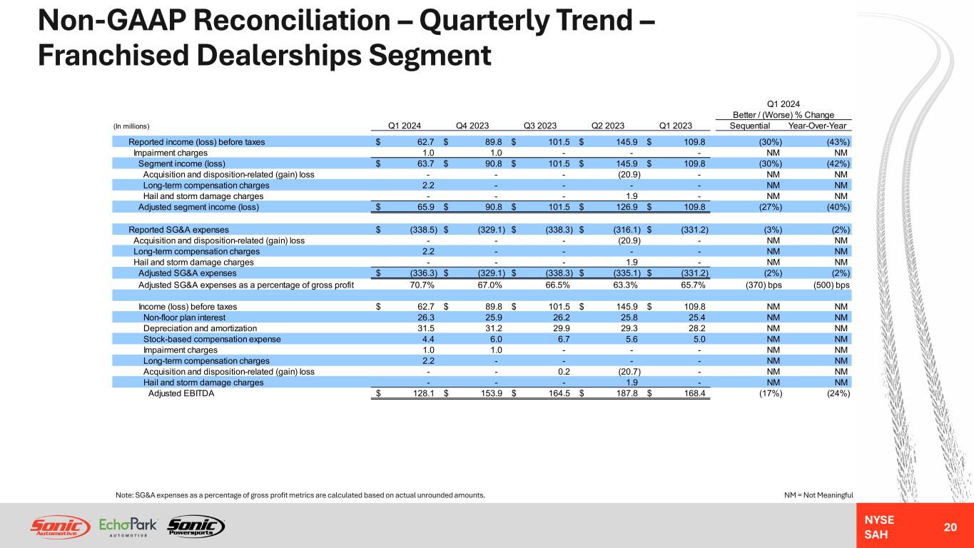 NYSE SAH GAAP Income Statement – Quarterly Trend – Franchised Dealerships Segment 19 NM = Not Meaningful Q1 2024 Better / (Worse) % Change (In millions, except unit and per unit data) Q1 2024 Q4 2023 Q3 2023 Q2 2023 Q1 2023 Sequential Year-Over-Year Revenues: Retail new vehicles 1,439.9$ 1,664.1$ 1,546.7$ 1,583.3$ 1,421.0$ (13%) 1% Fleet new vehicles 19.6 21.8 23.2 28.3 18.8 (10%) 4% Total new vehicles 1,459.5 1,685.9 1,569.9 1,611.6 1,439.8 (13%) 1% Used vehicles 729.3 727.5 780.7 774.5 767.6 0% (5%) Wholesale vehicles 48.6 39.3 51.4 55.6 58.4 23% (17%) Total vehicles 2,237.4 2,452.7 2,402.0 2,441.7 2,265.8 (9%) (1%) Parts, service and collision repair 439.9 425.2 431.8 433.4 423.8 3% 4% Finance, insurance and other, net ("F&I") 119.6 123.2 126.0 132.2 117.1 (3%) 2% Total revenues 2,796.9 3,001.1 2,959.8 3,007.3 2,806.7 (7%) 0% Gross profit: Retail new vehicles 94.1 122.2 125.5 136.9 134.0 (23%) (30%) Fleet new vehicles 0.7 0.9 0.9 1.3 0.9 (27%) (27%) Total new vehicles 94.8 123.1 126.4 138.2 134.9 (23%) (30%) Used vehicles 40.8 35.1 42.6 44.5 40.8 16% 0% Wholesale vehicles (0.2) (2.7) (1.5) (1.0) 1.9 93% (110%) Total vehicles 135.4 155.5 167.5 181.7 177.6 (13%) (24%) Parts, service and collision repair 220.8 212.6 215.1 215.4 209.6 4% 5% Finance, insurance and other, net 119.6 123.2 126.0 132.2 117.1 (3%) 2% Total gross profit 475.8 491.3 508.6 529.3 504.3 (3%) (6%) SG&A expenses (338.5) (329.1) (338.3) (316.1) (331.2) (3%) (2%) Impairment charges (1.0) (1.0) - - - NM NM Depreciation and amortization (29.8) (29.4) (28.2) (27.9) (26.5) (1%) (12%) Operating income (loss) 106.5 131.8 142.1 185.3 146.6 (19%) (27%) Interest expense, floor plan (16.0) (14.6) (12.9) (11.9) (9.9) (10%) (62%) Interest expense, other, net (27.8) (27.5) (27.9) (27.5) (26.9) (1%) (3%) Other income (expense), net - 0.1 0.2 - - NM NM Income (loss) before taxes 62.7$ 89.8$ 101.5$ 145.9$ 109.8$ (30%) (43%) Unit sales volume: Retail new vehicles 25,297 28,491 26,869 27,358 24,539 (11%) 3% Fleet new vehicles 379 500 469 590 441 (24%) (14%) Used vehicles 25,666 24,365 25,541 25,197 25,107 5% 2% Wholesale vehicles 5,105 4,440 5,163 5,516 5,483 15% (7%) Gross profit per unit ("GPU"): Retail new vehicles 3,722$ 4,289$ 4,672$ 5,003$ 5,463$ (13%) (32%) Used vehicles 1,592$ 1,440$ 1,666$ 1,765$ 1,626$ 11% (2%) F&I 2,348$ 2,330$ 2,403$ 2,516$ 2,360$ 1% (1%) Note: Gross profit per unit metrics are calculated based on actual unrounded amounts.
