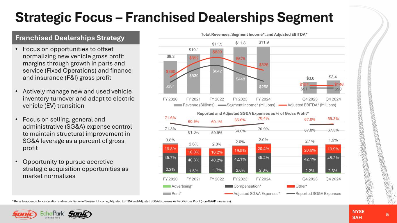 NYSE SAH Diversified Portfolio And Business Lines 4 Geographic Distribution TX 28% CA 24% CO 8% TN 7% FL 5% AL 5% NC 5% GA 4% ID 3% VA 2% MD 2% NV 2% All Others 5% Total Revenues By State Note: Percentages are percent of total for year ended December 31, 2024. 5% 32% 13% 42% 36% 8%46% 18% Revenue Gross Profit New Vehicle Used Vehicle (Including Wholesale) Parts, Service & Collision Repair ("Fixed Operations") Finance & Insurance ("F&I") Category % of Total Revenue Franchised Brand % of Total Revenue BMW 21% Mercedes 11% Audi 5% Lexus 4% Land Rover 4% Porsche 3% Cadillac 2% Other Luxury (1) 3% Honda 9% Toyota 7% Other Import (2) 3% EchoPark 15% Non-Franchised 15% Chevrolet GMC Buick 5% Ford 4% Chrysler Dodge Jeep RAM 3% Powersports 1% Powersports (3) 1% Luxury 53% 19%Import Domestic 12% (1) Includes Alfa Romeo, Jaguar, Maserati, MINI, Polestar and Volvo (2) Includes Hyundai, Nissan, Mazda, Subaru and Volkswagen (3) Includes Harley-Davidson, Kawasaki, BRP, Polaris, Honda, Suzuki, BMW Motorrad, Yamaha, Ducati, and Indian Motorcycle Business Line MixBrand Distribution