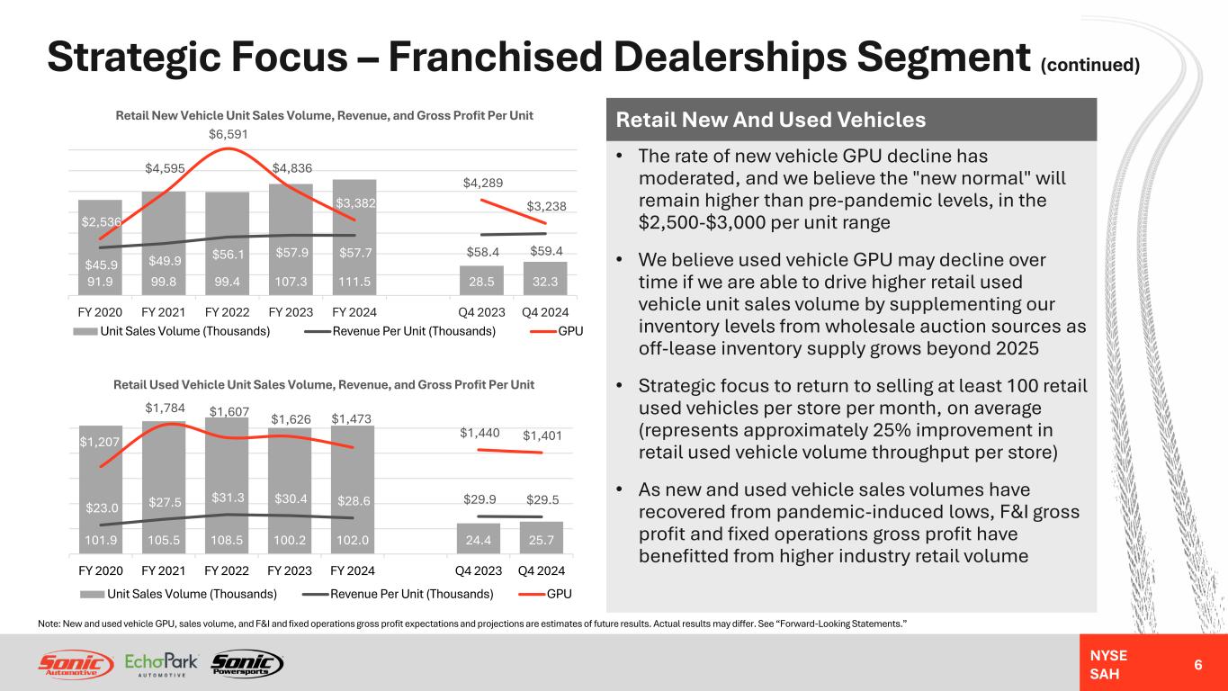 NYSE SAH Strategic Focus – Franchised Dealerships Segment • Focus on opportunities to offset normalizing new vehicle gross profit margins through growth in parts and service (Fixed Operations) and finance and insurance (F&I) gross profit • Actively manage new and used vehicle inventory turnover and adapt to electric vehicle (EV) transition • Focus on selling, general and administrative (SG&A) expense control to maintain structural improvement in SG&A leverage as a percent of gross profit • Opportunity to pursue accretive strategic acquisition opportunities as market normalizes Franchised Dealerships Strategy $8.3 $10.1 $11.5 $11.8 $11.9 $3.0 $3.4 $231 $530 $642 $448 $258 $91 $90 $360 $692 $839 $675 $526 $154 $146 FY 2020 FY 2021 FY 2022 FY 2023 FY 2024 Q4 2023 Q4 2024 Total Revenues, Segment Income*, and Adjusted EBITDA* Revenue (Billions) Segment Income* (Millions) Adjusted EBITDA* (Millions) * Refer to appendix for calculation and reconciliation of Segment Income, Adjusted EBITDA and Adjusted SG&A Expenses As % Of Gross Profit (non-GAAP measures). 5 2.3% 1.5% 1.7% 2.0% 2.8% 2.2% 2.3% 45.7% 40.8% 40.2% 42.1% 45.2% 42.1% 45.2% 19.8% 16.0% 16.2% 19.5% 20.4% 20.6% 19.9% 3.8% 2.6% 2.0% 2.0% 2.0% 2.1% 1.9% 71.6% 60.9% 60.1% 65.6% 70.4% 67.0% 69.3% 71.3% 61.0% 59.9% 64.6% 70.9% 67.0% 67.3% FY 2020 FY 2021 FY 2022 FY 2023 FY 2024 Q4 2023 Q4 2024 Reported and Adjusted SG&A Expenses as % of Gross Profit* Advertising* Compensation* Other* Rent* Adjusted SG&A Expenses* Reported SG&A Expenses
