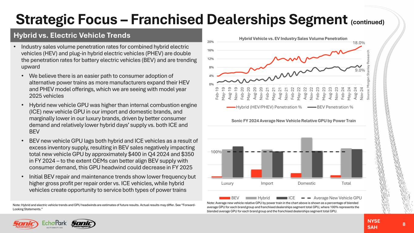 NYSE SAH Strategic Focus – Franchised Dealerships Segment (continued) 7 Fixed Operations And F&I • Increased technician headcount by 335 technicians in FY 2024, projected to generate approximately $100M in annualized fixed operations gross profit once fully productive • Fixed operations parts and labor cost inflation is generally passed along to customers, supporting stable fixed operations profit margins over time • Vehicle affordability challenges may drive consumers to choose to repair their current vehicle to extend its life rather than replace it with a newer vehicle, benefitting fixed operations revenues • F&I gross profit per unit increased nearly 50% from pre- pandemic to FY 2024, driven primarily by higher warranty contract penetration rates • We believe F&I GPU will remain structurally higher than pre- pandemic as a result of optimized F&I presentation and consumer preferences • Even in an elevated interest rate environment, finance contract penetration rates remain robust and are supported by manufacturer financing or lease incentives only available at franchised dealerships $1,846 $2,160 $2,453 $2,403 $2,374 $2,330 $2,424 77.9% 77.6% 72.9% 71.2% 72.6% 70.7% 72.6% 40.9% 44.4% 49.4% 48.9% 48.0% 47.1% 46.5% FY 2020 FY 2021 FY 2022 FY 2023 FY 2024 Q4 2023 Q4 2024 F&I Gross Profit Per Unit and Product Penetration Rates F&I GPU Finance Contract Penetration Rate Warranty Penetration Rate $595 $673 $787 $853 $909 $213 $238 49.8% 50.2% 49.5% 49.7% 50.4% 50.0% 50.8% FY 2020 FY 2021 FY 2022 FY 2023 FY 2024 Q4 2023 Q4 2024 Fixed Operations Gross Profit and Gross Margin % Fixed Operations Gross Profit (Millions) Fixed Operations Gross Margin % Note: Technician headcount, fixed operations profit margin and F&I GPU are estimates of future results. Actual results may differ. See “Forward-Looking Statements.”