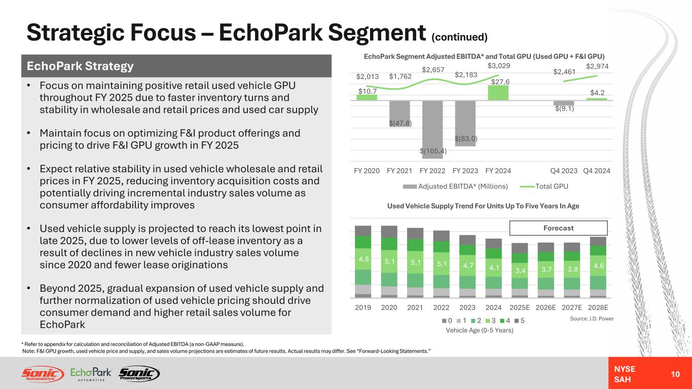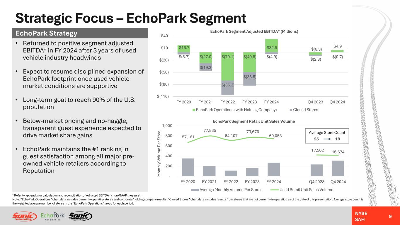 NYSE SAH Strategic Focus – EchoPark Segment • Returned to positive segment adjusted EBITDA* in FY 2024 after 3 years of used vehicle industry headwinds • Expect to resume disciplined expansion of EchoPark footprint once used vehicle market conditions are supportive • Long-term goal to reach 90% of the U.S. population • Below-market pricing and no-haggle, transparent guest experience expected to drive market share gains • EchoPark maintains the #1 ranking in guest satisfaction among all major pre- owned vehicle retailers according to Reputation EchoPark Strategy * Refer to appendix for calculation and reconciliation of Adjusted EBITDA (a non-GAAP measure). Note: “EchoPark Operations” chart data includes currently operating stores and corporate/holding company results. “Closed Stores” chart data includes results from stores that are not currently in operation as of the date of this presentation. Average store count is the weighted average number of stores in the “EchoPark Operations” group for each period. $16.7 $(27.0) $(70.1) $(49.5) $32.5 $(6.3) $4.9 $(5.7) $(19.3) $(35.3) $(33.5) $(4.9) $(2.8) $(0.7) $(110) $(80) $(50) $(20) $10 $40 FY 2020 FY 2021 FY 2022 FY 2023 FY 2024 Q4 2023 Q4 2024 EchoPark Segment Adjusted EBITDA* (Millions) EchoPark Operations (with Holding Company) Closed Stores 57,161 77,835 64,107 73,676 69,053 17,562 16,674 - 200 400 600 800 1,000 FY 2020 FY 2021 FY 2022 FY 2023 FY 2024 Q4 2023 Q4 2024 M on th ly V ol um e Pe r S to re EchoPark Segment Retail Unit Sales Volume Average Monthly Volume Per Store Used Retail Unit Sales Volume Average Store Count 25 18 9